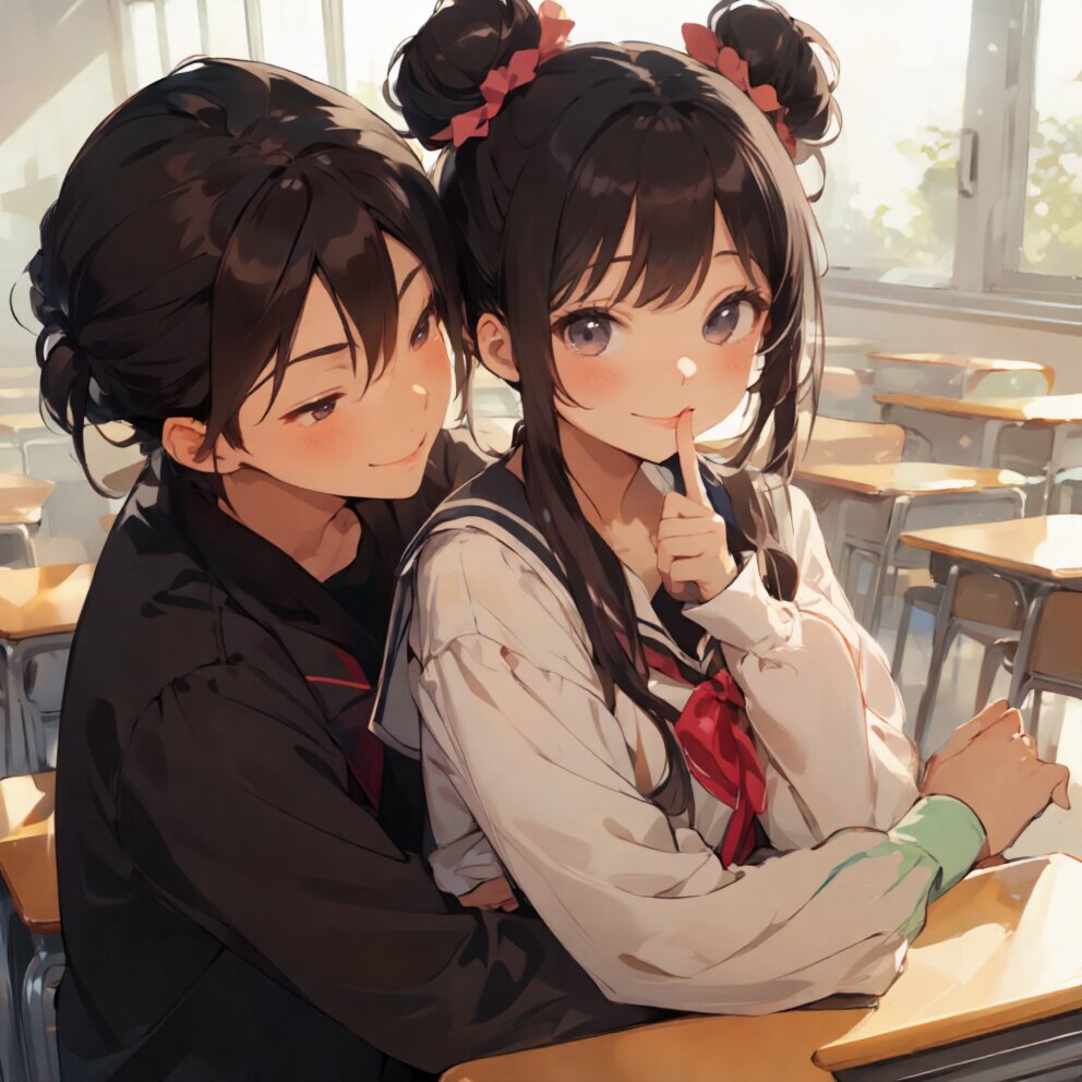 masterpiece, best quality, 2body, 1girl, Placing her index finger on her lip, kawaii, smile, black little double bun, highschooler, hugging the boy, 1boy, good looking, kawaii, highschooler, in the class room,