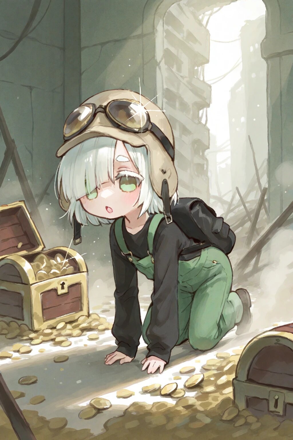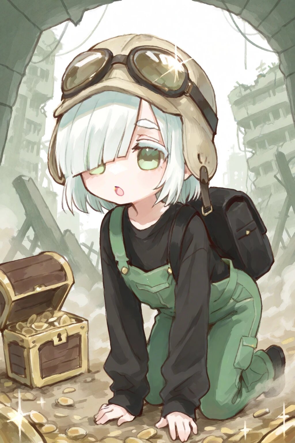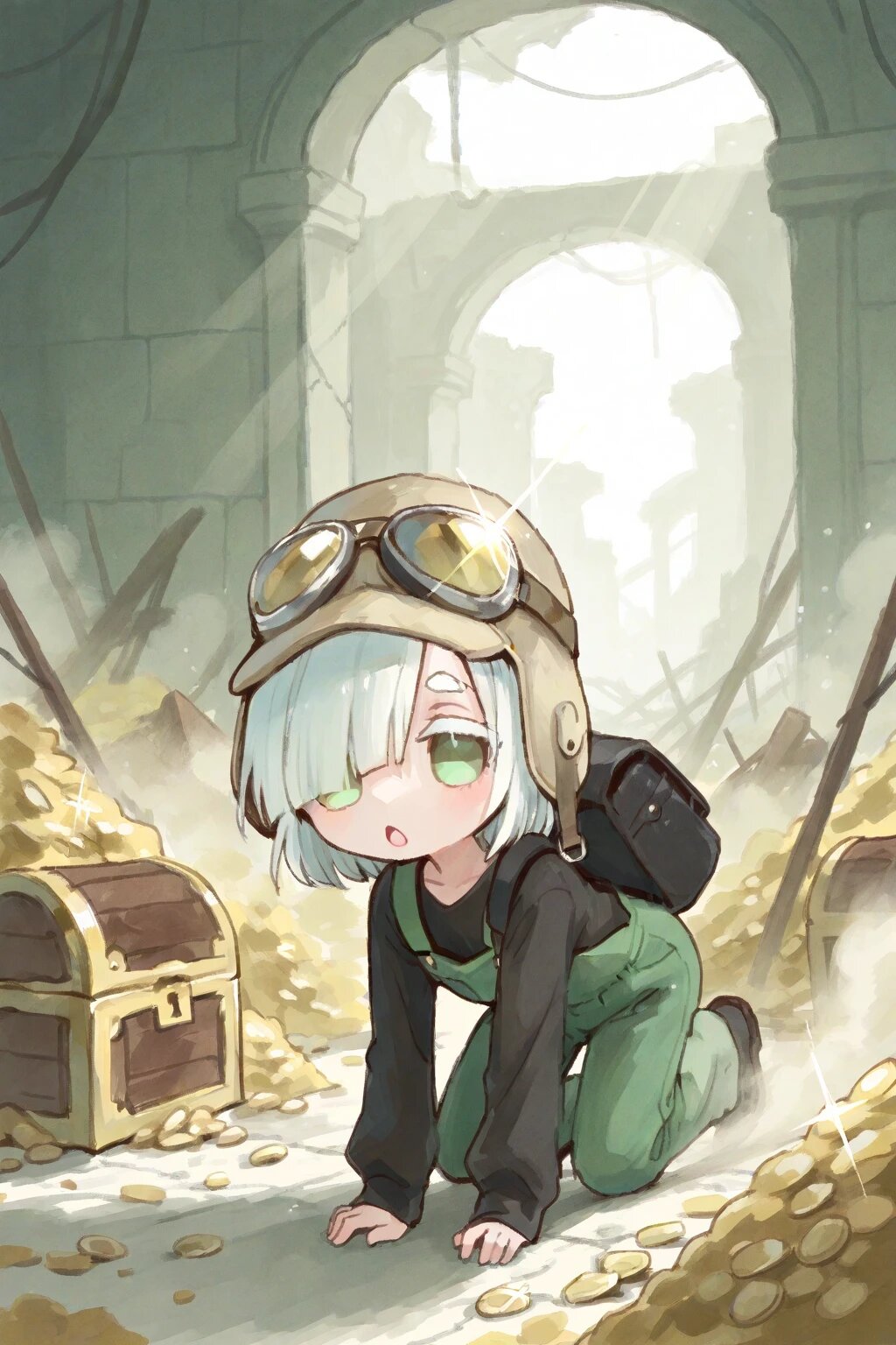 chibi, solo, 1girl, ruins, sunlight, dust, many gold coins, treasure chest, ((glint)), crawling on all fours, aviator hat, green overalls, black shirt, long sleeves, :o, (bright white hair), short hair, blunt bangs, white thick eyebrow, white colored eyelashes, (hair over one eye), mint green eyes, sleeves past wrists, black backpack, ultra-detailed, best quality, masterpiece, very aesthetic, watercolor painting, general