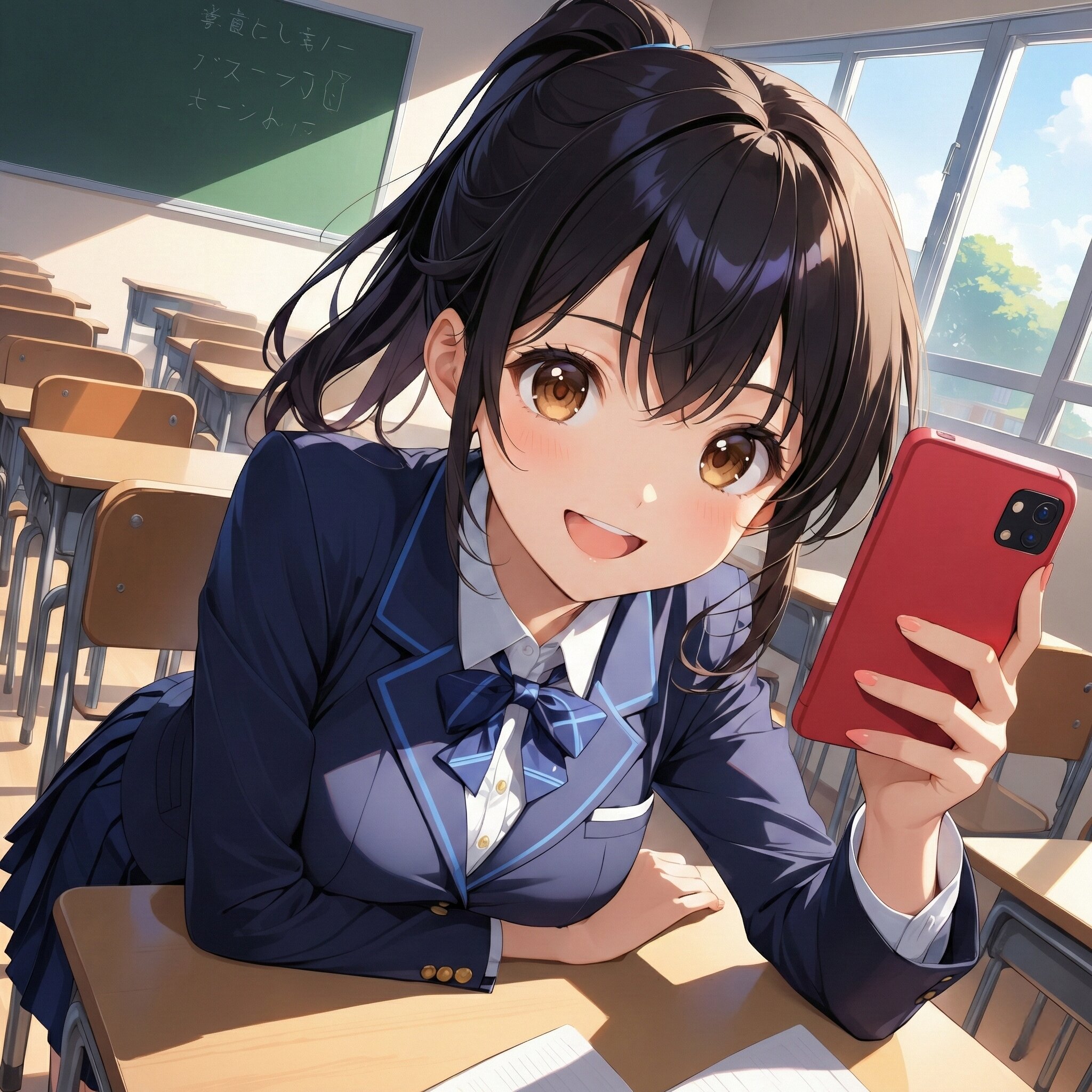 1girl, (young girl), cute face and eyes, big breasts, black hair, clear black eyes, single short ponytail hair, cute and lovely, Vigorous, lively, and spontaneous personality, (selfie:1.2), holding smartphone, close-up shot, looking at viewer, bright happy smile, open mouth, energetic expression, slight dutch angle, (school uniform:1.1), navy blue blazer, white blouse, navy blue stick ribbon tie, navy blue pleated skirt, (black socks, brown loafers:0.8), indoors, school classroom background, desks, chairs, blackboard, daylight through window, masterpiece, best quality, high resolution, highly detailed, beautiful anime art style, vivid colors, detailed eyes, sharp focus