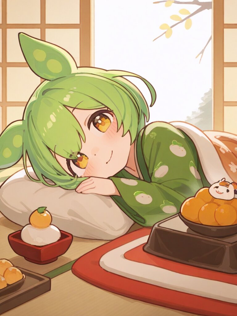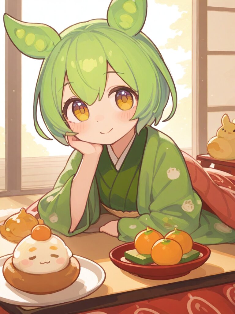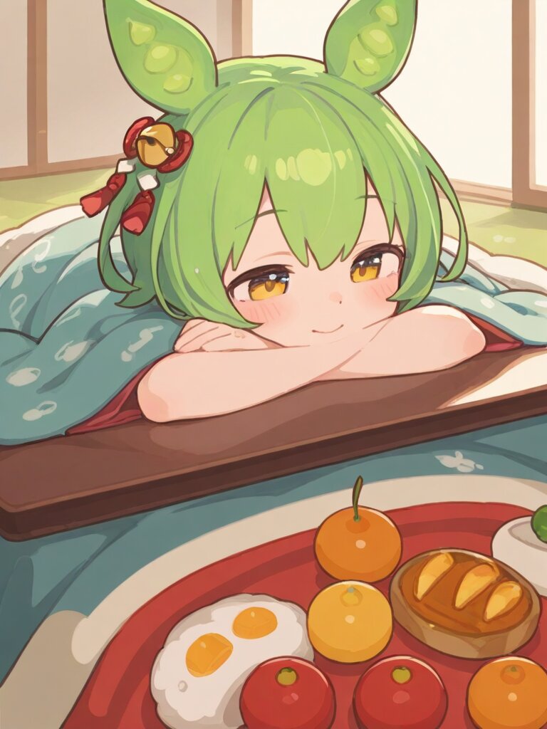 zundamon,voicevox A cute, green-haired anime character with horse-themed hair accessories is relaxing under a kotatsu table during the Year of the Horse New Year celebration. The character is wearing a cozy, traditional Japanese kimono with festive patterns, surrounded by New Year decorations such as kagami mochi, oranges, and horse figurines. The room is warm and inviting, with soft sunlight streaming through the window, creating a peaceful and cheerful holiday atmosphere.