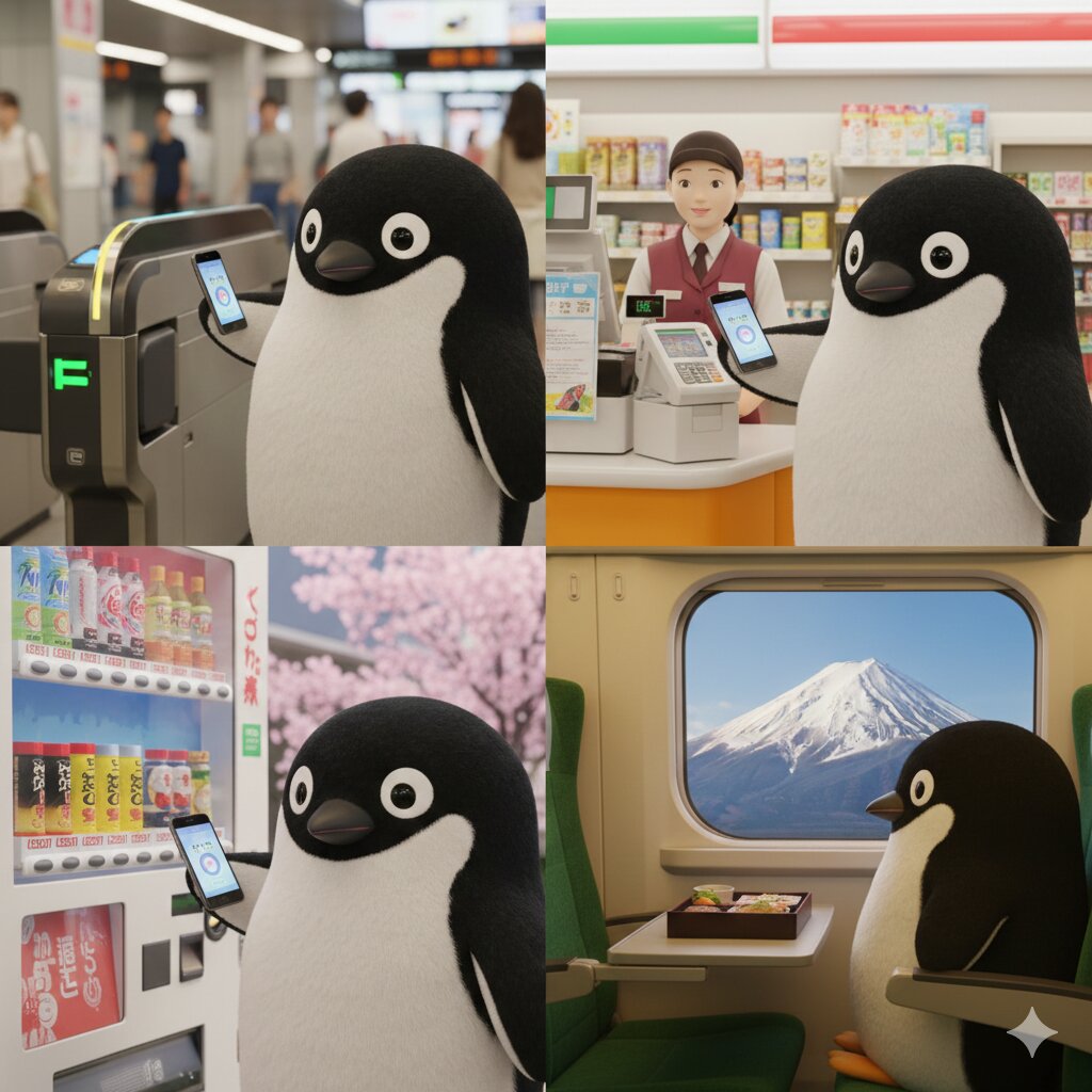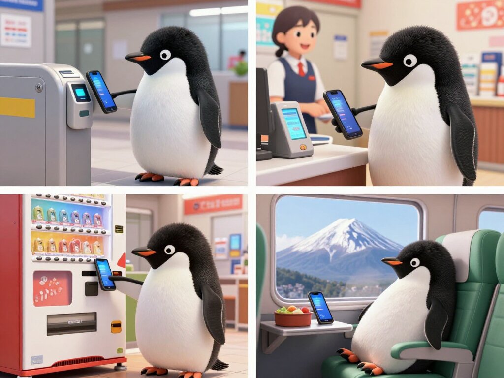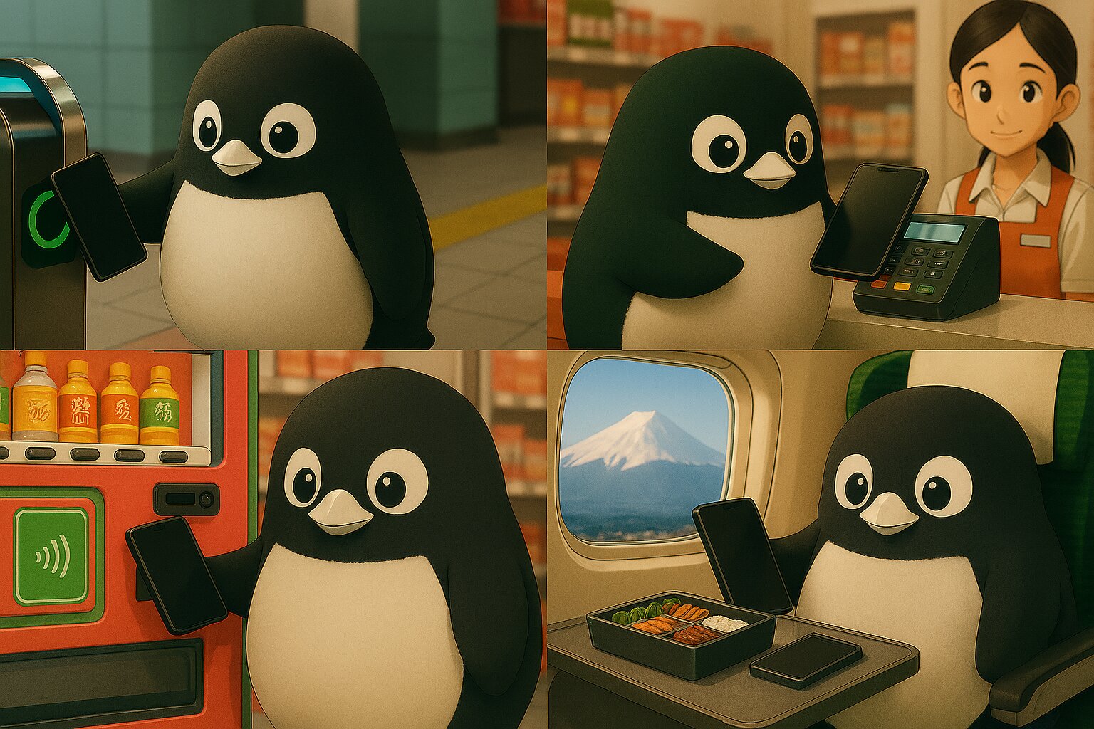 A four-panel collage work. It depicts an adorable, plump Adélie penguin (based on a watermelon mascot motif) living a modern digital life. The penguin has a completely black head, a white beak, and white eye rings. Panel 1: The penguin passes through a sleek, modern Japanese station ticket gate. It taps a black smartphone held in its right flipper against the IC card reader. Panel 2: At a convenience store checkout counter, the penguin holds its smartphone with its flipper and pays at the payment terminal. A friendly clerk is visible in the background. Panel 3: In front of a colorful Japanese beverage vending machine, the penguin taps its smartphone on the contactless sensor. Panel 4: Relaxing in a green Shinkansen seat, gazing out the window at Mount Fuji. The smartphone rests on the tray table next to the bento box. Style: High-quality 3D rendering, soft cinematic lighting, vivid colors, cute and approachable atmosphere, detailed texture rendering of the penguin's feathers and modern Japanese setting.