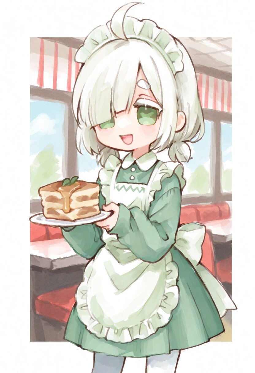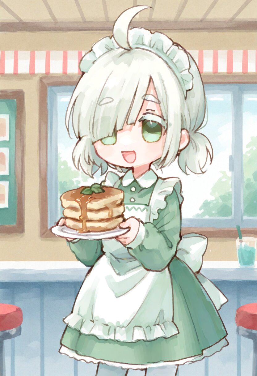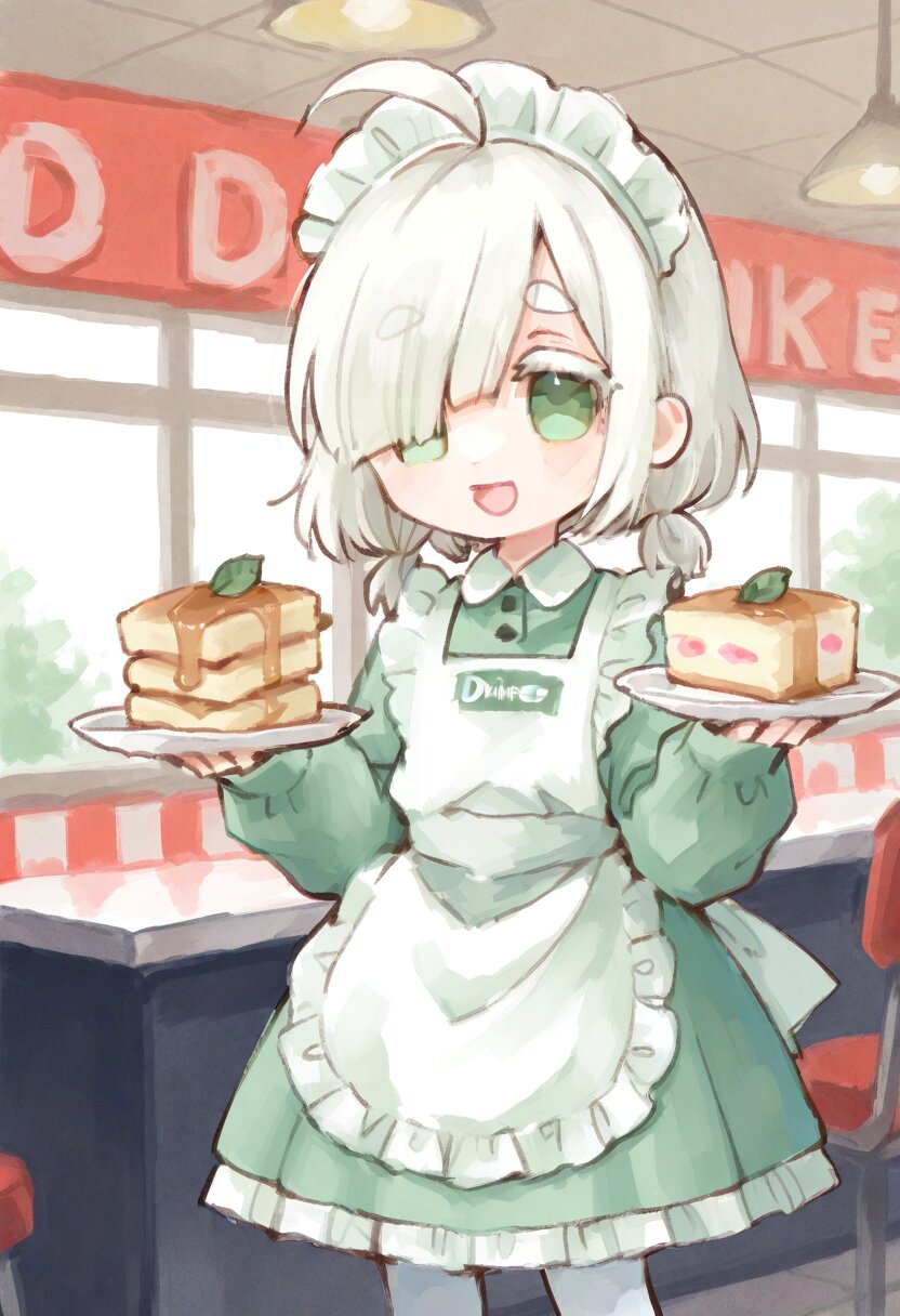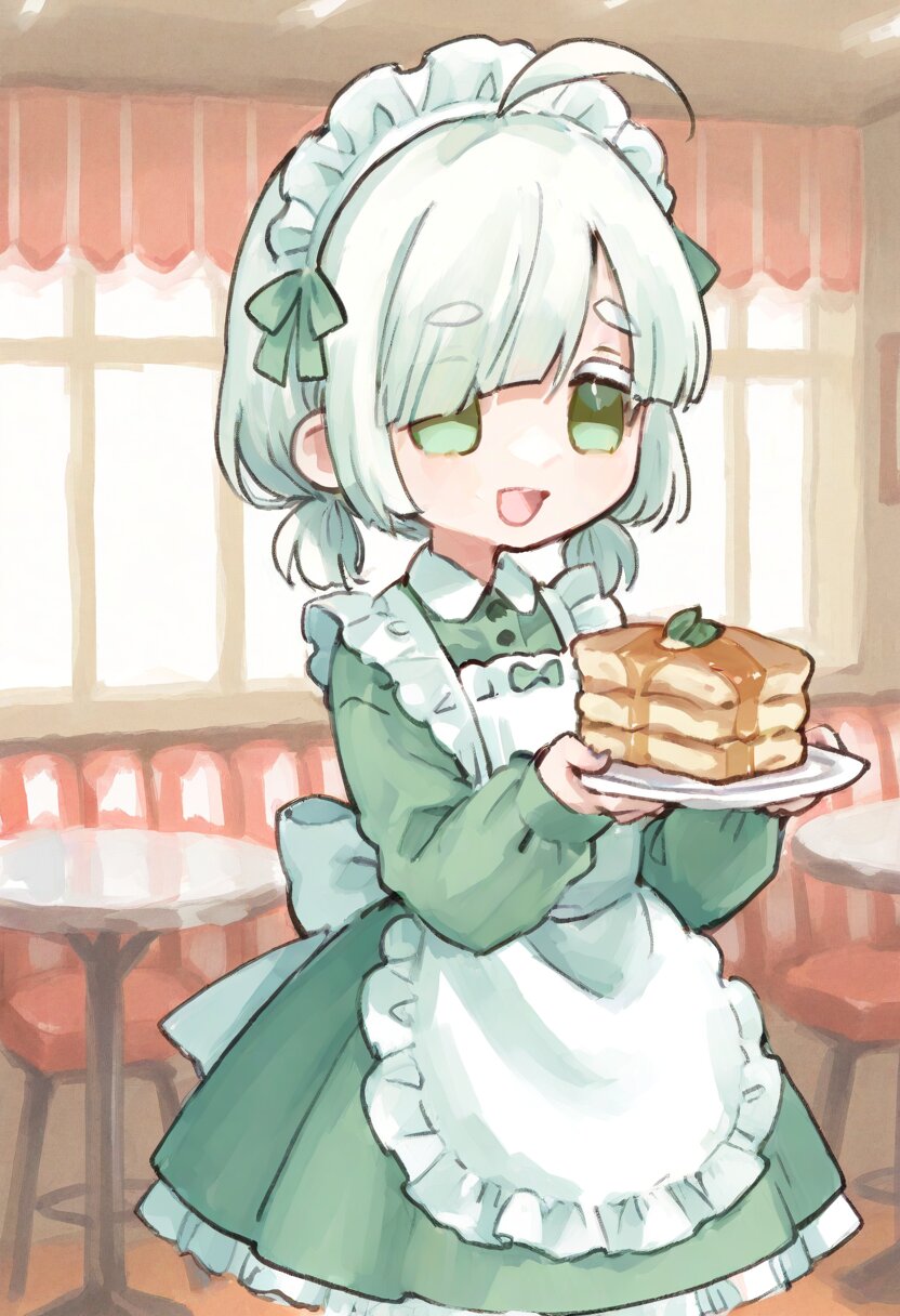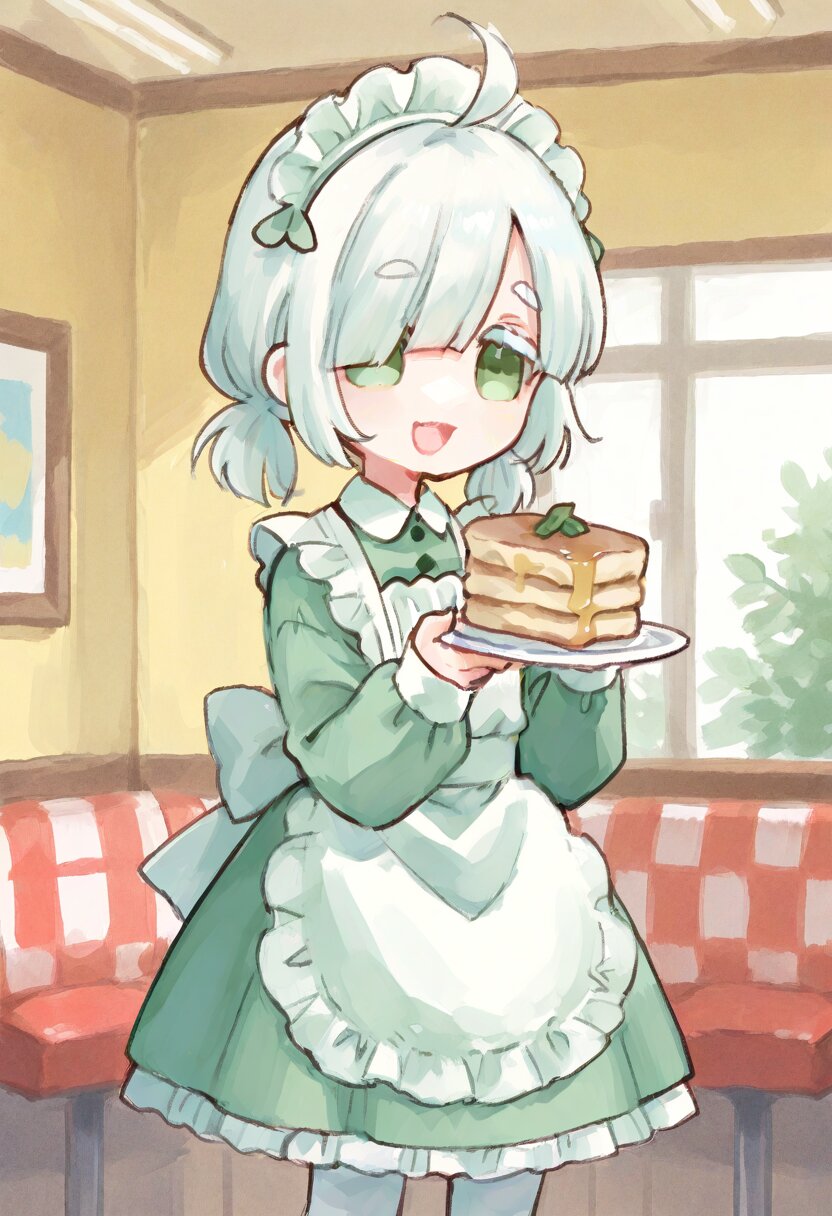 <lora:inmnstyleilxl:0.9>, chibi, solo, 1girl, diner, upper body, holding plate of pancakes, light green dress, sleeves past wrists, frilly white apron, maid head dress, white tights, smile, open mouth, (bright white hair), short hair, short low pigtails, blunt bangs, white thick eyebrow, white colored eyelashes, (hair over one eye), ahoge, mint green eyes, ultra-detailed, best quality, masterpiece, very aesthetic, watercolor painting, general