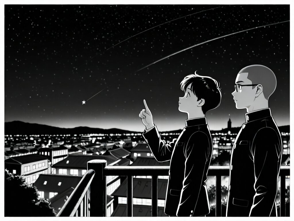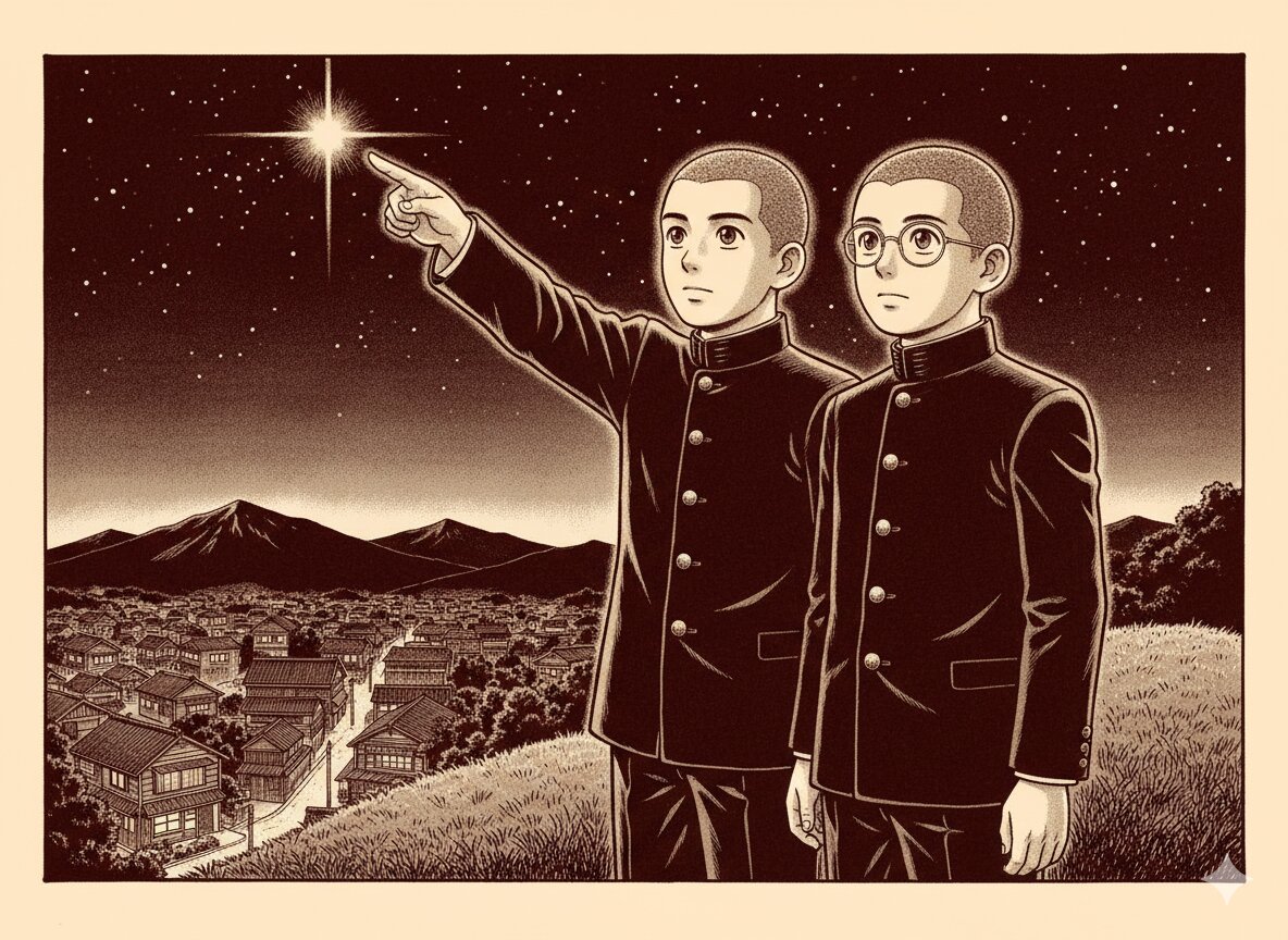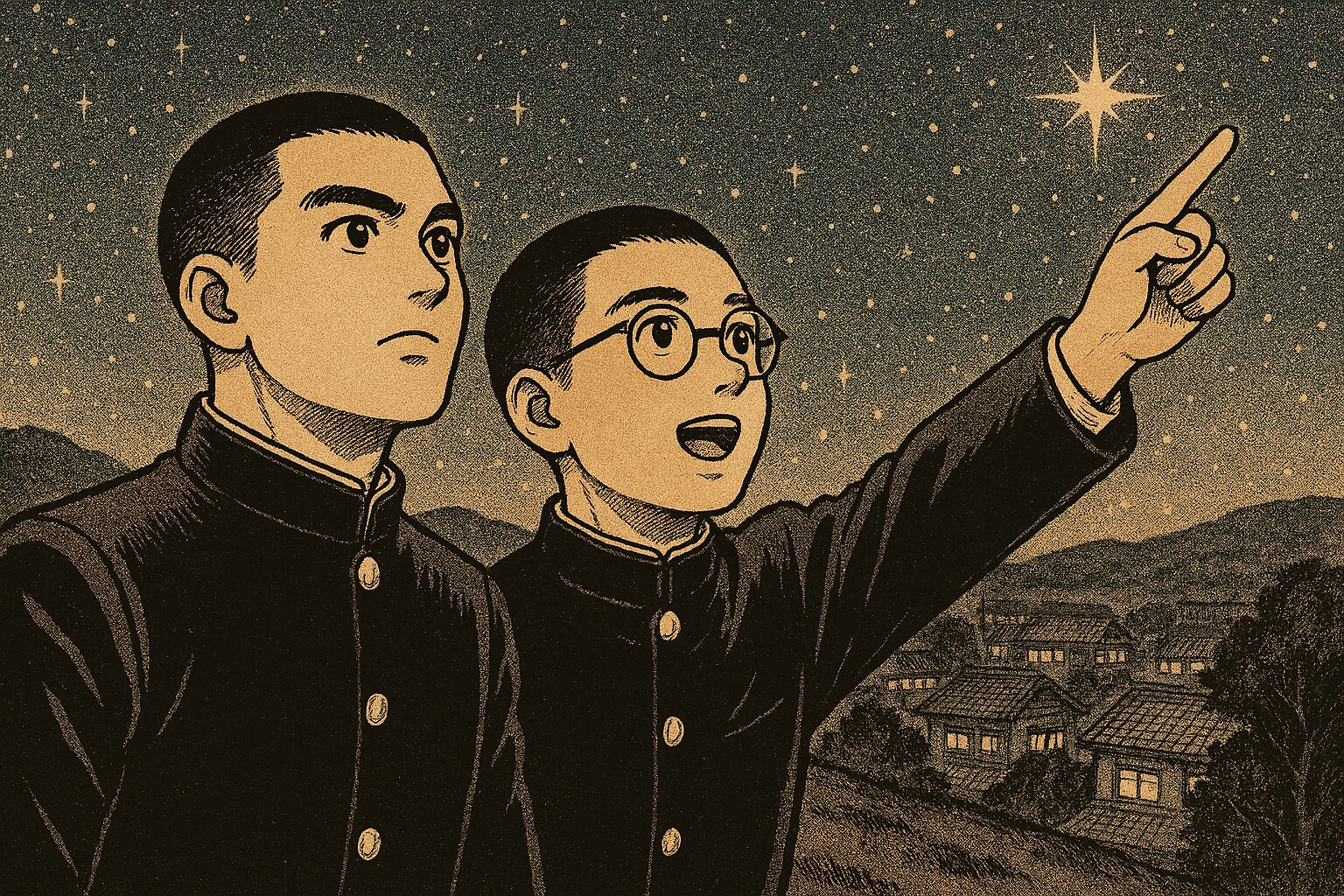 Retro Japanese manga style illustration, 1951 Showa era aesthetic. Two young Japanese aspiring manga artists wearing dark high school student uniforms (Gakuran) with standing collars. One youth is a handsome young man with a buzz cut, and the other is a youth with a buzz cut wearing round glasses. They are standing on a hill overlooking a nostalgic Japanese town at night. The youth with glasses is pointing his arm diagonally upward toward the brightest, most shining star in the starry night sky. Their eyes are filled with hope and determination. The artwork features classic G-pen line work, vintage screen-tone textures, and a nostalgic, warm atmosphere inspired by early Japanese manga masterpieces.