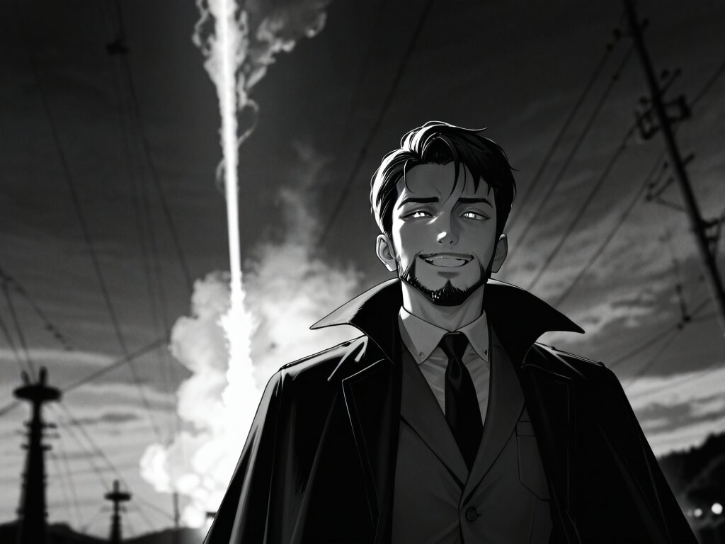 Masterpiece, Best Quality, Amazing Quality, Very Aesthetic, High Resolution, Ultra-Detailed, Absurdres, Newest, Scenery, 3D, Rendered, General, 1Male, (Mature_Male:1.2), Aged_Up, Male_Focus, solo focus, 1950s suit, necktie, looking up, triumphant smile, smug, mad scientist, intense eyes, charismatic, cinematic lighting, high contrast, film grain, monochrome, greyscale, historical photo, retro aesthetic, night, outdoor, rocket launch in background, fire trail, smoke, cape canaveral,, Cinematic_Lighting, BREAK, Depth_of_Field, Volumetric_Lighting,