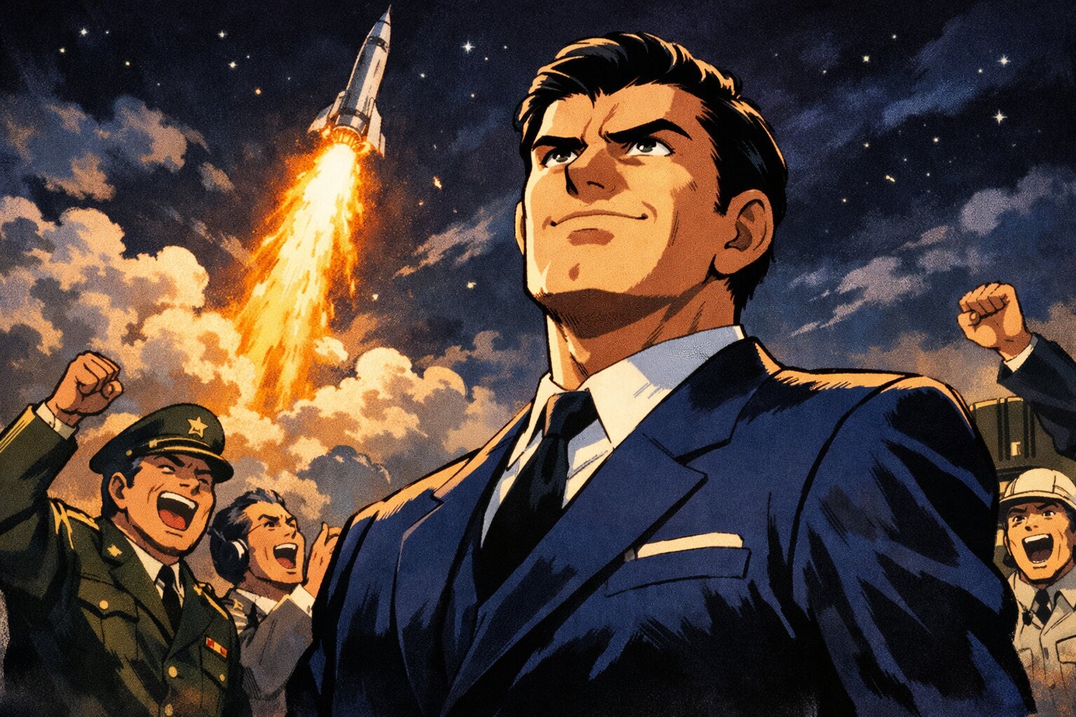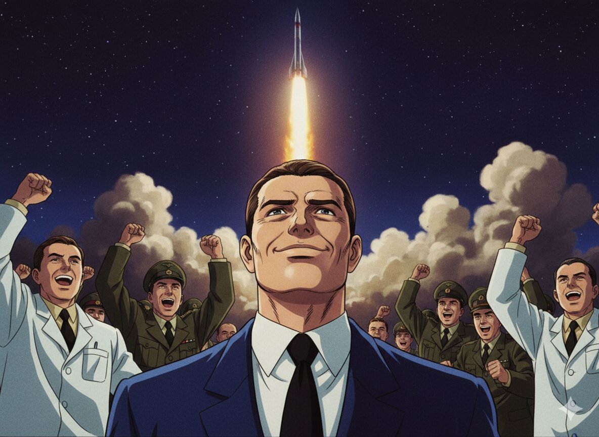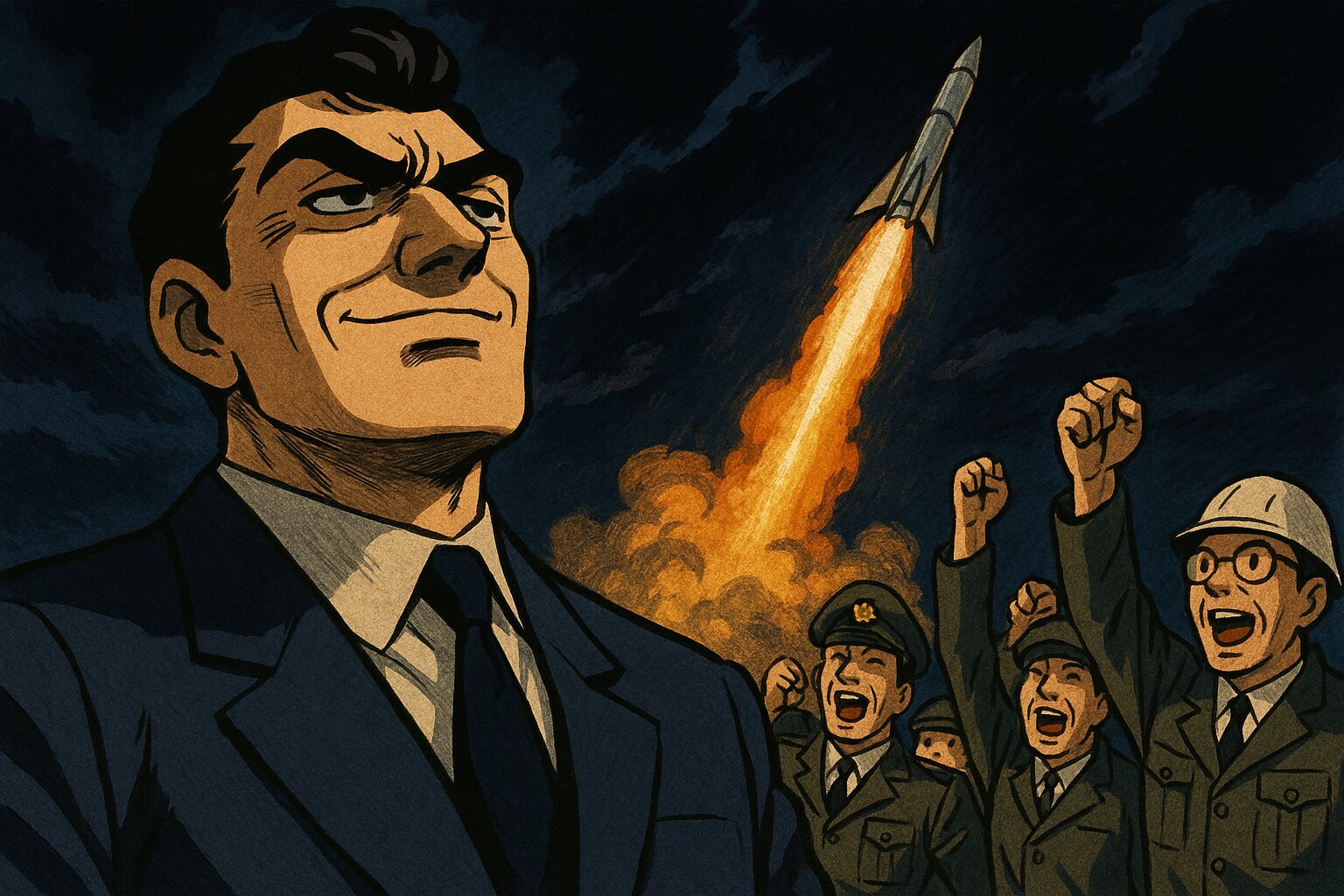 プロンプトコーナー。実在の人物・物が想起されるので念のため二次創作にしてあります。今回はフォン・ブラウン氏をマッドサイエンティスト博士とし「エクスプローラー1号の打ち上げを黒い表情でニヤつきながら見送っている」というシチュエーションにしました。あくまでフィクションです(汗...