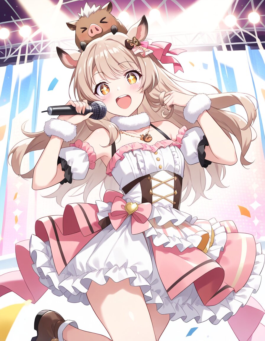 1girl, solo, light brown hair, long hair, amber eyes, wild boar ears on head, animal ears, cute boar-like ears with tufts, energetic idol pose, singing and dancing dynamically, open mouth singing, sparkling eyes, happy excited expression, idol outfit with wild boar theme, frilly idol skirt with boar tusk patterns, brown and pink color scheme, fur-trimmed sleeves and collar like boar mane, boar fang accessories on hair or necklace, ribbon with boar motifs, microphone in hand, dynamic stage performance pose, jumping or twirling, spotlights, colorful stage background with confetti and hearts, energetic atmosphere, detailed clothing frills and textures, shiny hair, (masterpiece, best quality, ultra detailed, high resolution, absurdres:1.3), anime style, vibrant idol colors, cute and wild vibe