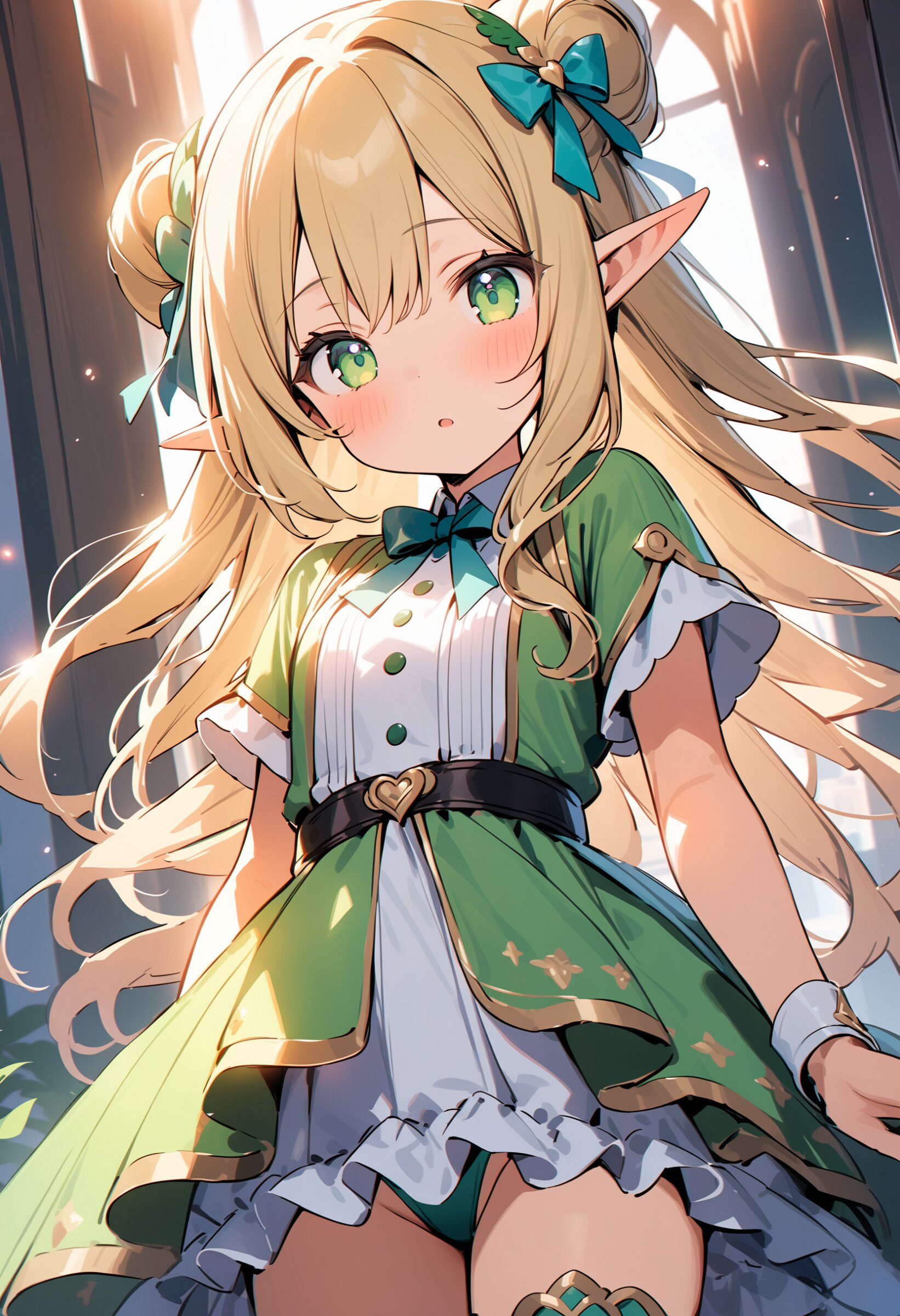 ((masterpiece)), ((best quality)), ((kawaii)), cute, (lovely), ((extremely detailed)), (beautiful), dynamic angle, a cute girl, 1girl, solo, ((elf)),beautiful blond hair, beautiful green eyes, ((beautiful eyes)), long hair, fantasy clothes,
