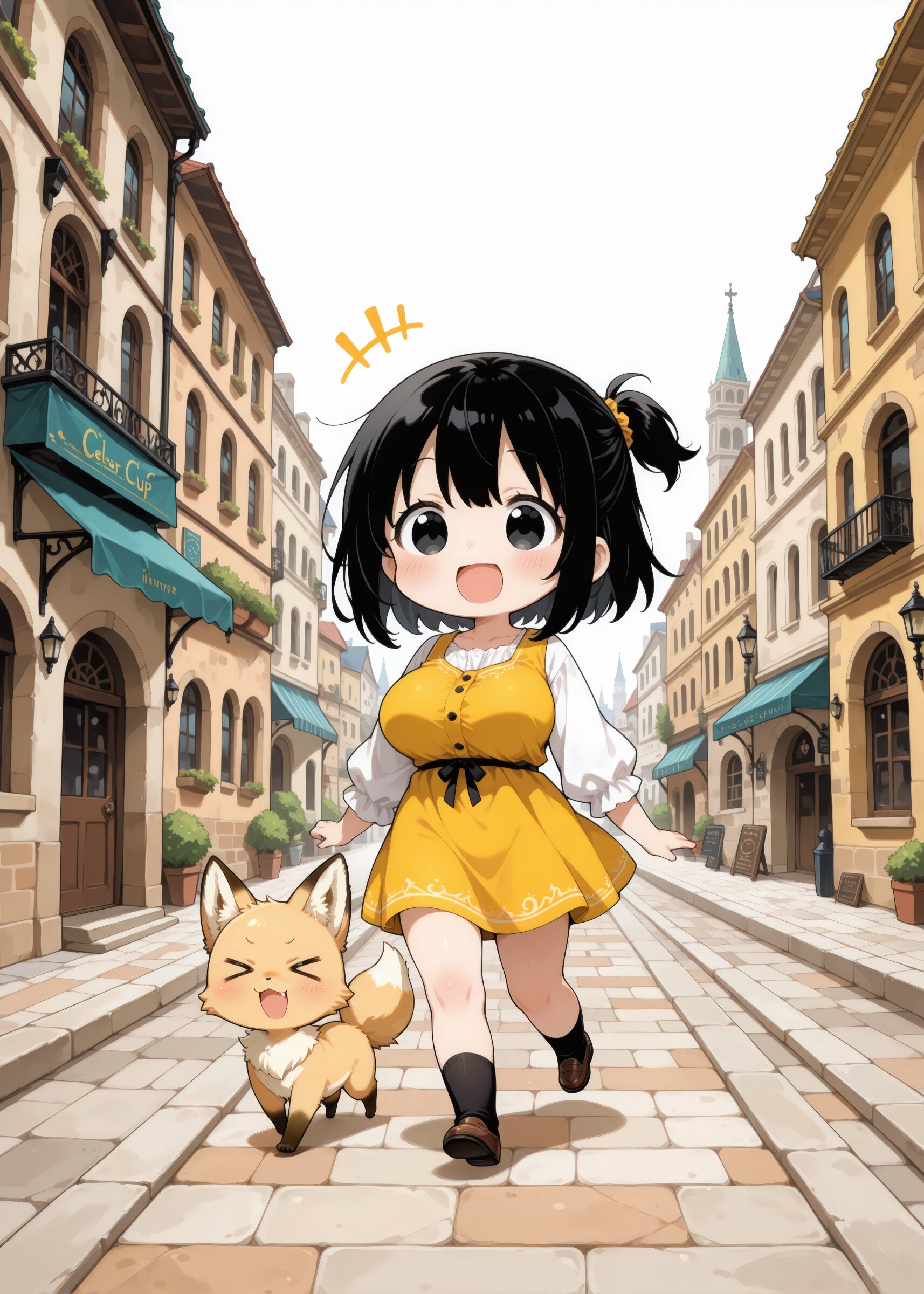 Best quality, Masterpieces, negative space, white background, fine detail, simple background, minimal, chibi world, flat, deformed, arrival at a gentle futuristic canal city inspired by Venice, warm yellow and golden stone buildings, solarpunk-inspired city, minimal neon, 1girl walking, 1girl, (young girl), cute face and eyes, big breasts, black hair, clear black eyes, single short ponytail hair, cute and lovely, Vigorous, lively, and spontaneous personality, 1girl, (young girl), chibi, cute face and eyes, black hair, clear black eyes, single short ponytail hair, cute and lovely, Vigorous, lively, and spontaneous personality, happy, chibi, cute small fox cub, +++, ><, open mouth,