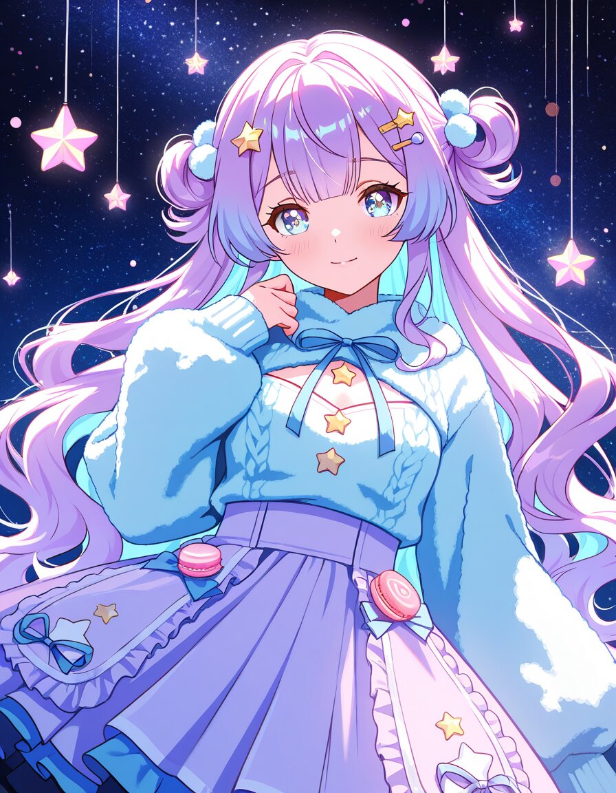 masterpiece, best quality, highest quality, absurdres, newest, 1girl, teenage girl, soft anime face, gentle expression, calm violet eyes, looking at viewer, pastel purple hair, light blue inner hair, fluffy long hair, loosely wavy hair, soft flowing hair, straight-cut (bangs:1.6), star-shaped hairpin, pastel color theme, soft pastel tones, dreamy atmosphere, star theme, stars in background, floating tiny stars, sparkling star particles, candy theme, sweets, lollipops, macarons, pastel cupcakes, chocolate stars, candy decorations, cute hair ornaments, star accessories, ribbon, frills, wearing cute pastel lolita dress OR pastel sweater and skirt, soft fabric, fluffy sleeves, gentle lighting, rim light, bokeh, dreamy starry sky background, candy wonderland, extremely detailed, finely detailed face, detailed eyes, sharp focus