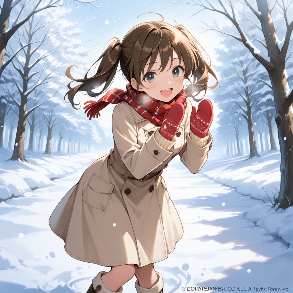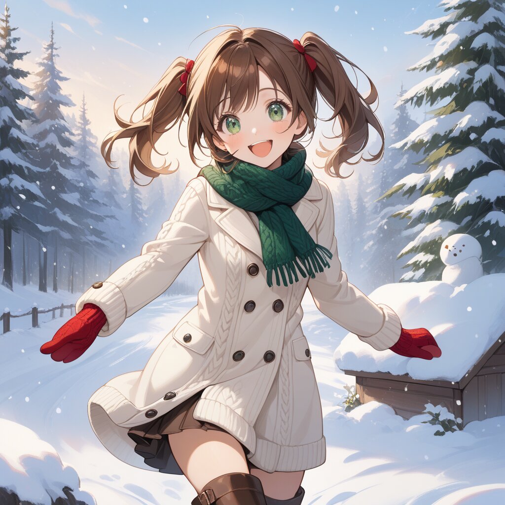 Best quality, Masterpieces, 1girl, cute pose, (brown hair), twintails, dark green eyes, large expressive eyes, (beautiful eyes), small breasts, white long sleeve long coat, warm knit sweater, scarf, mittens, wool skirt, knee-high boots, cheerful, snowy landscape, snow falling, laughing, winter scener,