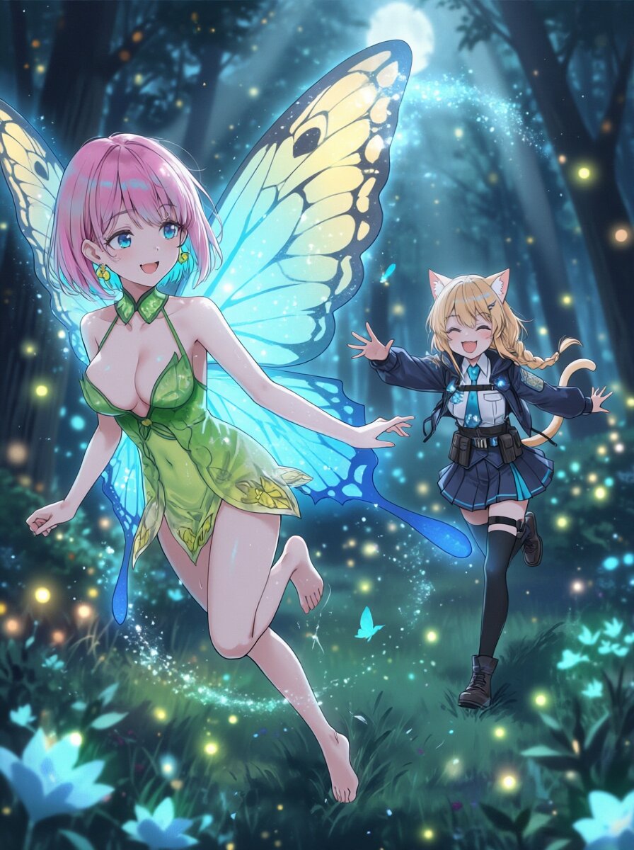 masterpiece, best quality, anime style, night forest, bioluminescent atmosphere, glowing particles in the air, magical fireflies, soft moonlight through trees, motion, dynamic scene, sense of depth, cinematic close shot, medium close-up composition, upper body emphasis, faces prominent in frame, expressive faces, shallow depth of field, background bokeh, BREAK 1girl, closed eyes, long blonde hair, braid, hair between eyes, natural small cat ears, natural cat tail, medium breasts, :3, big smile, open mouth, smiling, running forward, arms outstretched, looking ahead, energetic pose, skirt and hair flowing, chasing, dark navy short jacket, moonlight blue inner lining, lightweight pleated skirt, skirt flowing in motion, thigh high socks, slim utility belt pouch, agile fantasy scout outfit, night patrol style, subtle moon motif accessory, BREAK 1girl, butterfly fairy girl, petite, pink bob hair, blunt bangs, blue inner hair, light blue eyes, round eyes, glowing blue eyes, beautiful pupils, Clear eyes, beautiful eyes, huge breasts, butterfly earrings, butterfly patterned dress, butterfly skirt, large butterfly wings, translucent wings, glowing wings, bare feet, floating, flying forward while looking back, playful smile, teasing expression, light trail behind her flight path, sparkling dust trail, BREAK interaction, chasing game, playful mood, both laughing, friendship energy, perspective from slightly behind the running girl, fairy ahead in the air, depth of field, motion blur on background, light rays, fantasy atmosphere, pastel anime