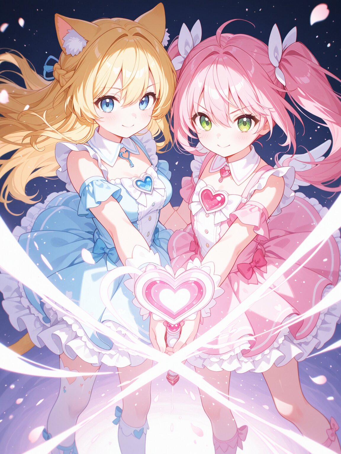masterpiece, best quality, high quality, ultra detailed, highres, official art, anime key visual, professional illustration, sharp lineart, clean lineart, delicate lineart, smooth shading, soft shading, detailed shading, vivid colors, soft lighting, soft glow, rim light, depth of field, subtle bloom, light particles, 2girls, standing side by side, upper body, facing viewer, dynamic magical girl pose, heroic pose, confident smile, v-shaped eyebrows, :>, synchronized pose, team pose, BREAK (girl A:1.15), left side, blue eyes, long blonde hair, braid, hair between eyes, natural small cat ears, natural cat tail, medium breasts, magical girl outfit, frilly dress, ribbons, heart motifs, collared dress, pastel blue and white color scheme, matching outfit, BREAK (girl B:1.15), right side, petite, flat chest, long twintails, pink hair, green eyes, magical girl outfit, frilly dress, ribbons, heart motifs, collared dress, holding staff, heart-shaped staff, pastel pink color scheme, matching outfit, BREAK distinct faces, different hairstyles, balanced composition, BREAK cute aesthetic style, kawaii style, soft colors, pastel colors, magical aura, floating light particles, heart-shaped light effects, symmetrical composition, character focus