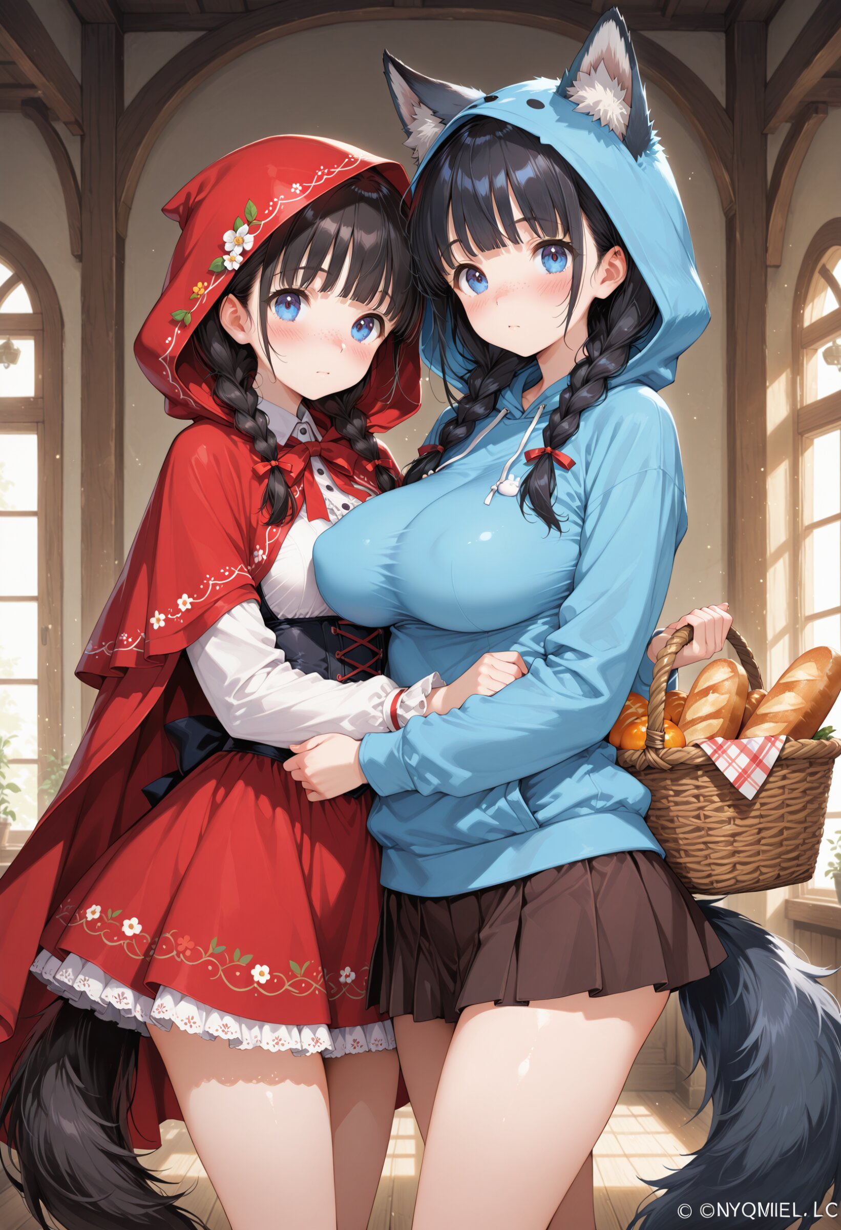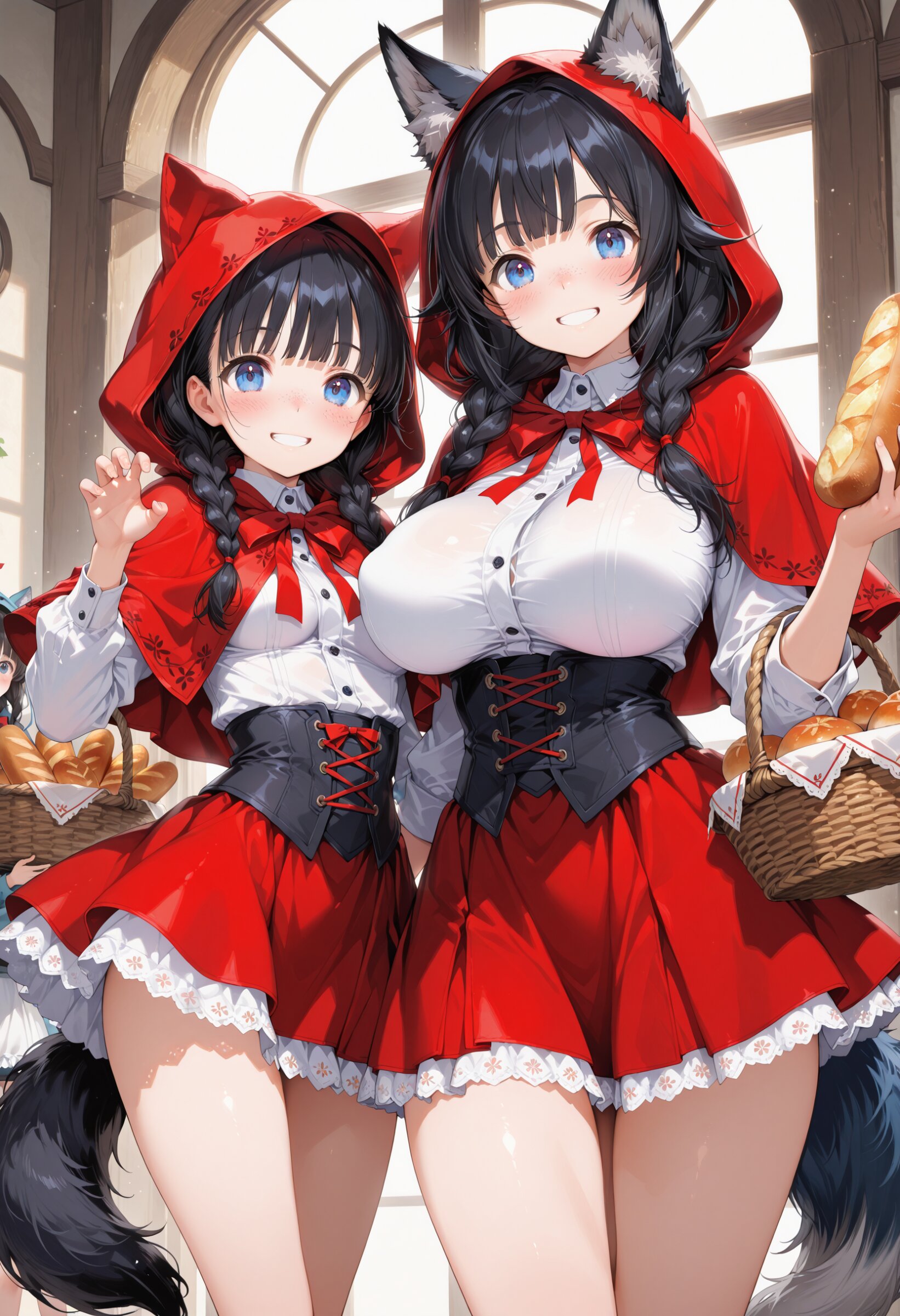 masterpiece, best quality, amazing quality, general, fine detail, official art, 2girls, girl and wolf girl, petite, little red riding hood, floating skirt, thighs, black hair, blue eyes, low twin braids, blunt bangs, freckles, holding basket with bread, low-key lighting, red ribbon, miniskirt, big breasts, impossible clothes, perky breasts, blush, wolf ear hoodie, wolf tail, big breasts, perky breasts, impossible clothes, grin, smile, claw pose,