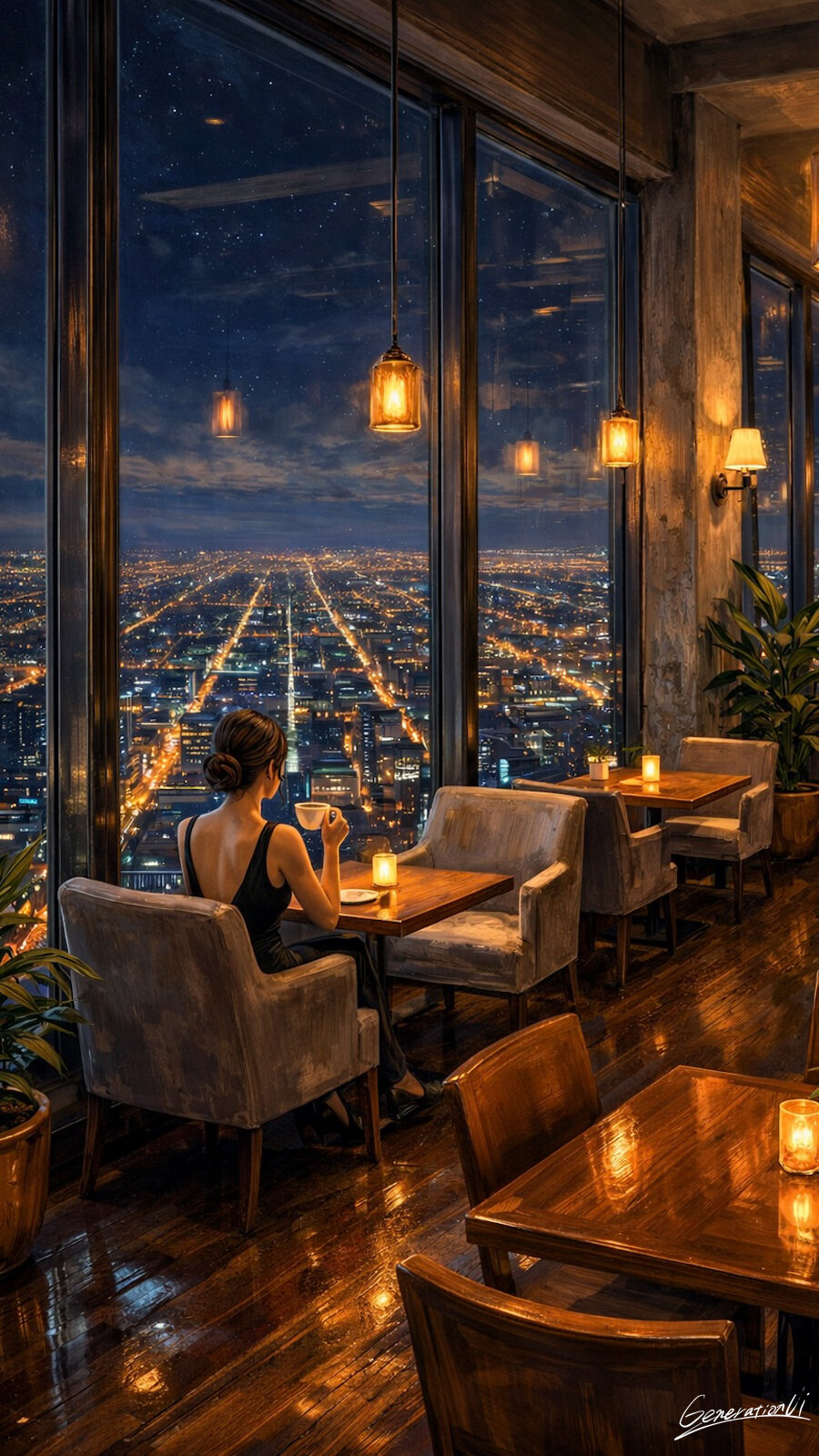 窓の向こうで、街の灯りが宝石みたいに並んでいる。