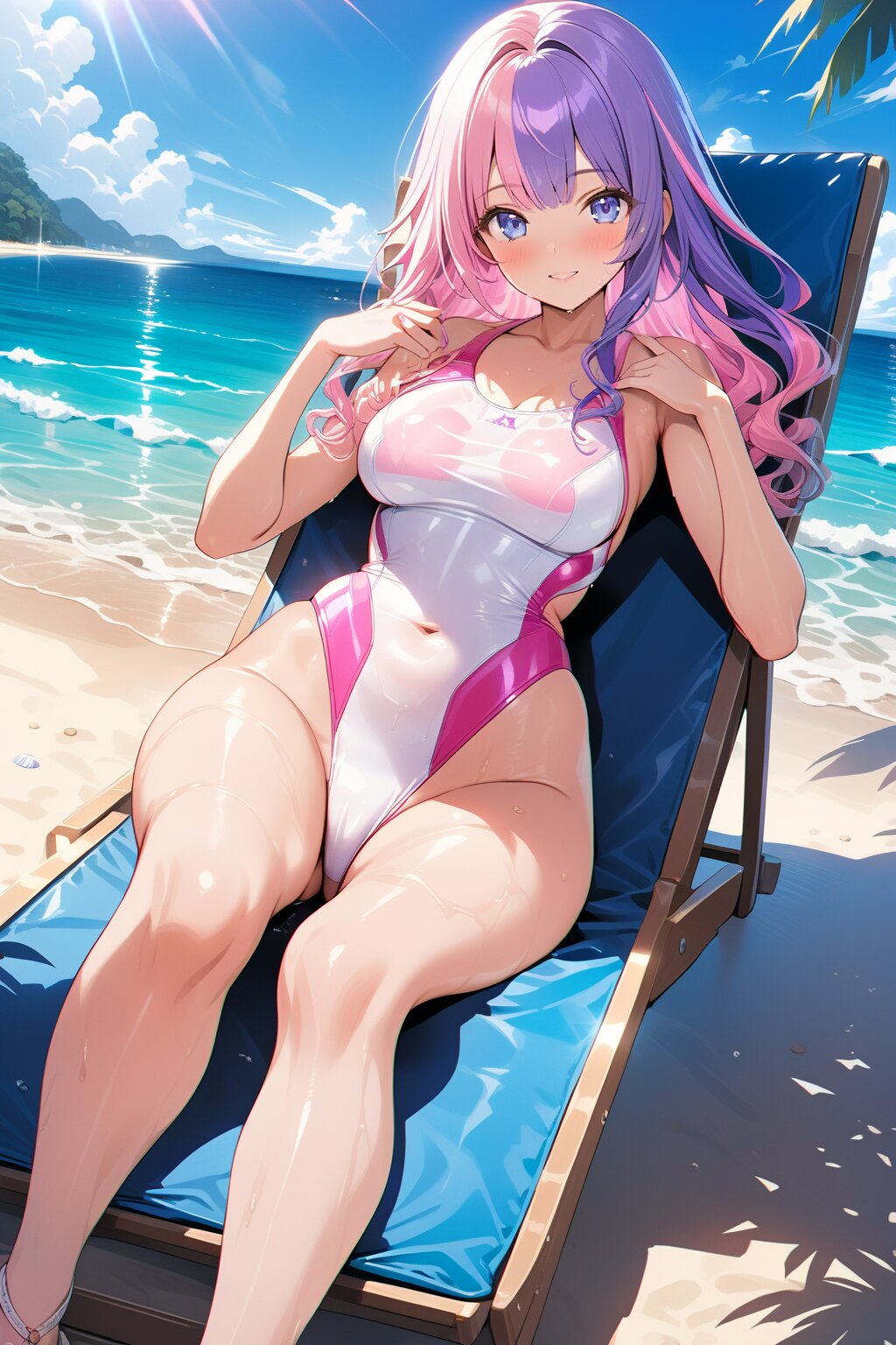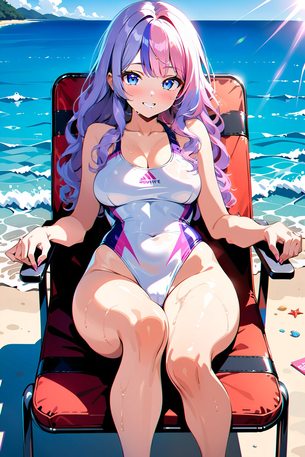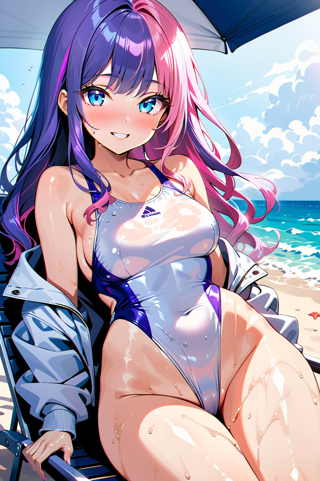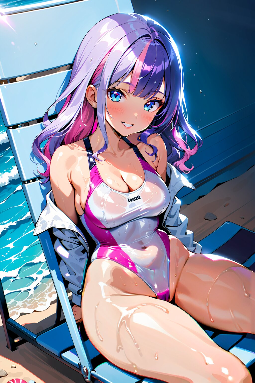 1girl, solo, sitting, (sitting on beach chair:1.3), looking at viewer, (outdoor, summer, fantastic sunshine, beach, (beach chair:1.3), reflection, artificial lighting), BREAK ((split-color hair:1.5), ((purple hair:1.2), (pink hair:1.2)):1.3), (two-tone hair:1.2), (long wavy hair:1.5), bangs, (blue eyes:1.2), japanese_girl, (medium breasts:1.3), (curvy:1.3), (voluptuous:1.2), (shiny skin, wet skin, gleaming skin:1.4), (smile:1.3), blush, (white swimsuit:1.4), (shiny white highleg competition swimsuit:1.5), (plunking neckline:1.3), (white jacket:1.2, open jacket, off shoulder), ((8k, masterpiece ,best quality ,ultra-detailed)), game cg, masterpiece, (perfect face:1.1025), (perfect hands:1.1025), (perfect legs:1.1025), (perfect arms:1.1025), (perfect fingers:1.1025), <lora:xl_more_art-full_v1:0.6> <lora:add-detail-xl:1>