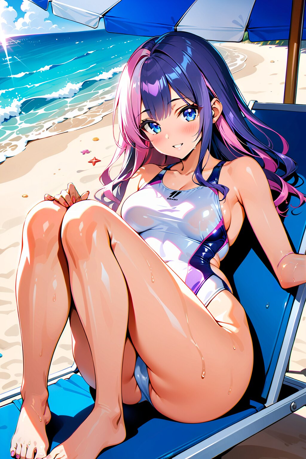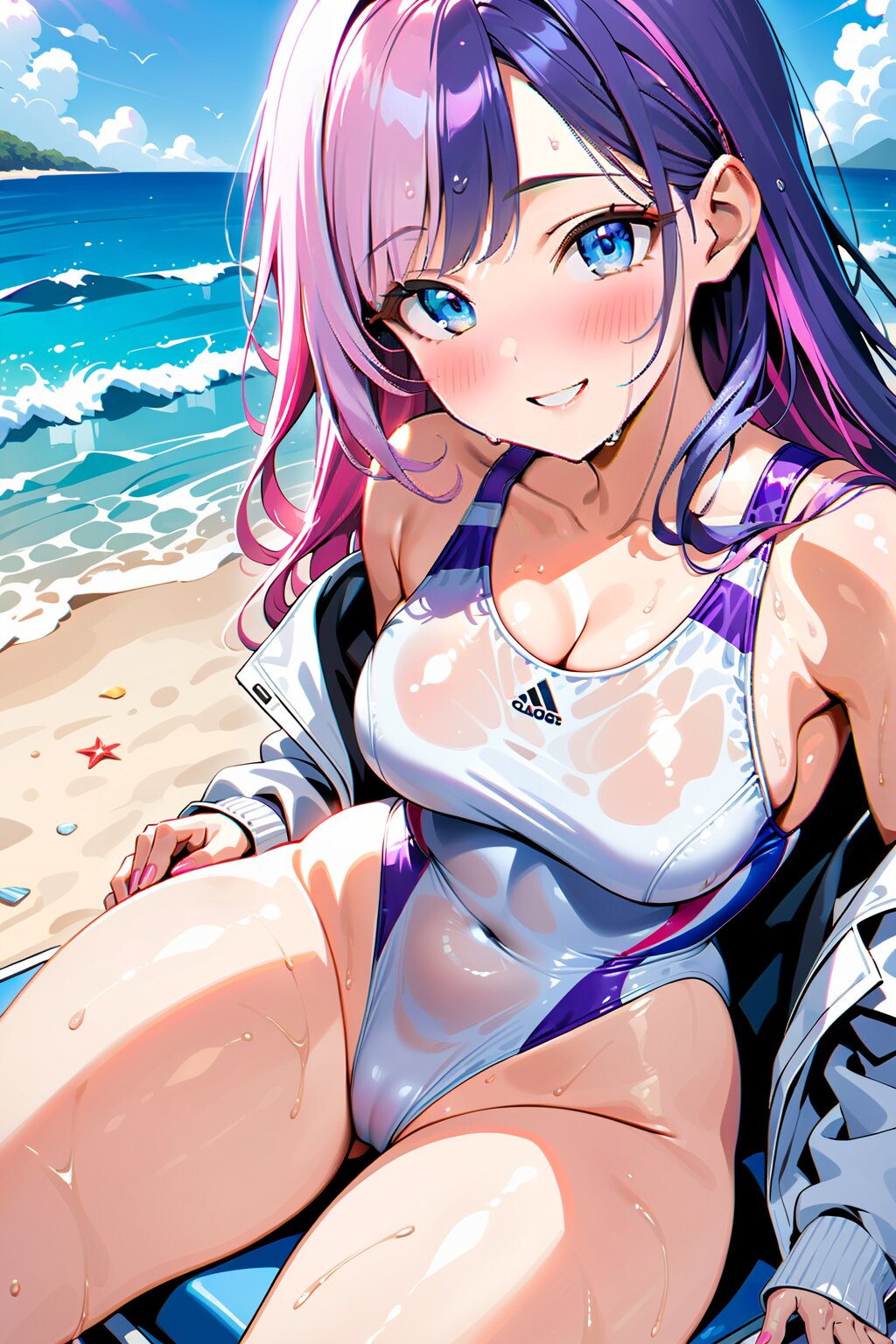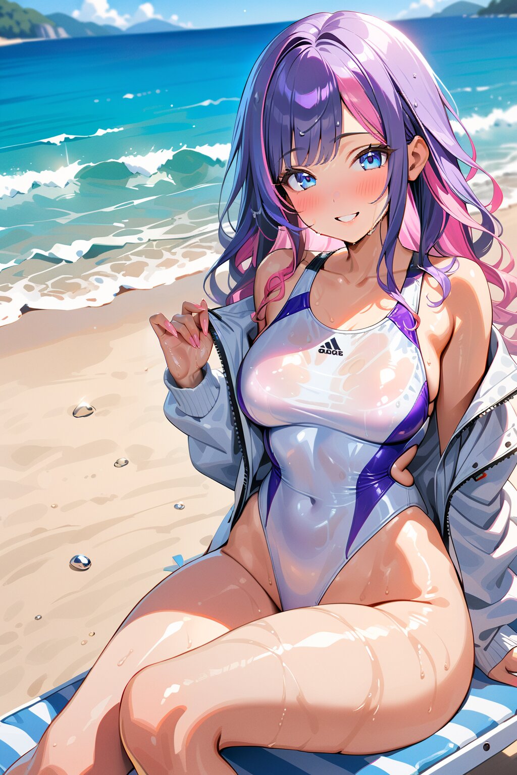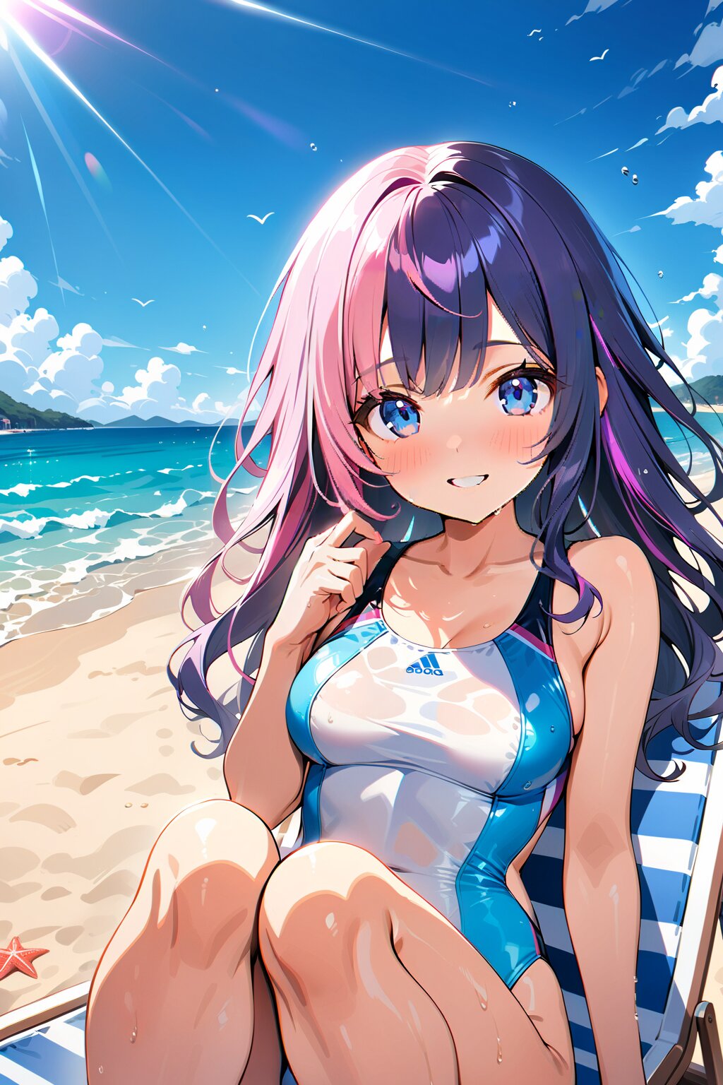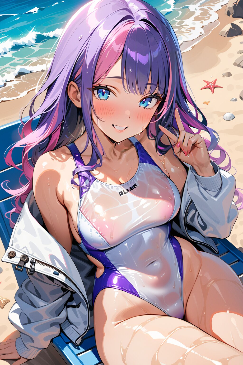 1girl, solo, sitting, (sitting on beach chair:1.3), looking at viewer, (outdoor, summer, fantastic sunshine, beach, (beach chair:1.3), reflection, artificial lighting), BREAK ((split-color hair:1.5), ((purple hair:1.2), (pink hair:1.2)):1.3), (two-tone hair:1.2), (long wavy hair:1.5), bangs, (blue eyes:1.2), japanese_girl, (medium breasts:1.3), (curvy:1.3), (voluptuous:1.2), (shiny skin, wet skin, gleaming skin:1.4), (smile:1.3), blush, (white swimsuit:1.4), (shiny white highleg competition swimsuit:1.5), (plunking neckline:1.3), (white jacket:1.2, open jacket, off shoulder), ((8k, masterpiece ,best quality ,ultra-detailed)), game cg, masterpiece, (perfect face:1.1025), (perfect hands:1.1025), (perfect legs:1.1025), (perfect arms:1.1025), (perfect fingers:1.1025), <lora:xl_more_art-full_v1:0.6> <lora:add-detail-xl:1>