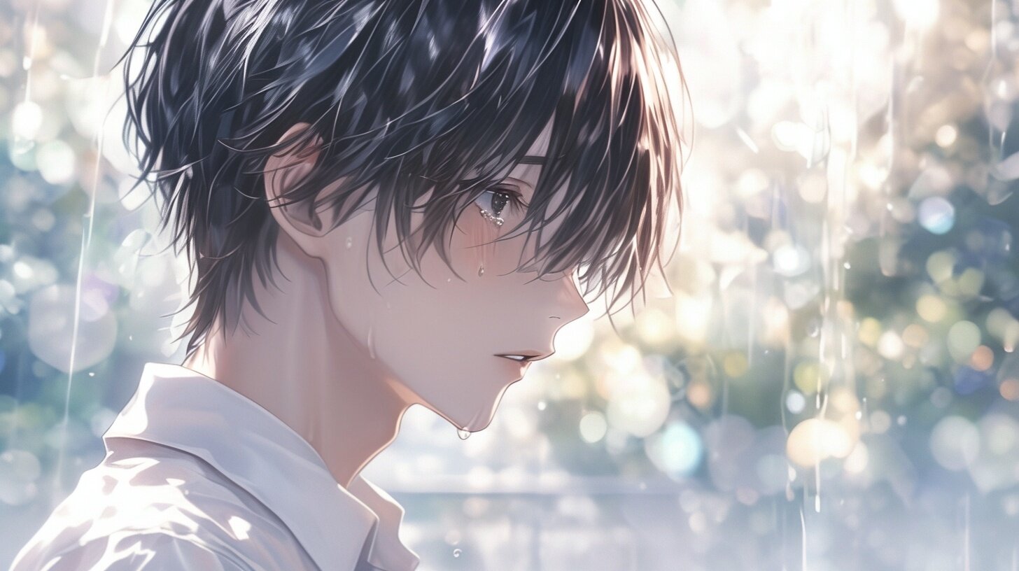 Short hair with straight black hair, beautiful young man with beautiful short hair, tears, high school students