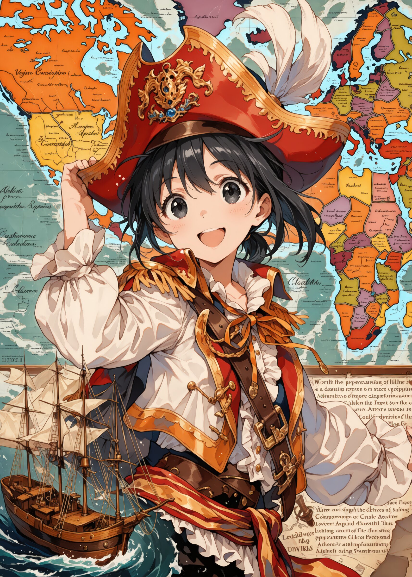 masterpiece, best quality, beautiful and aestheti, professional illustrasion, ultra detail, extremely detailed, highest detailed, absurdres, highres, colorfull, intricate, anime style illustration, Age of Exploration, merchant fleets sailing the seas, fierce storms and perilous adventures, the discovery of spices, memories of circumnavigating the globe, a female captain standing against a world map backdrop., 1girl, (young girl), cute face and eyes, big breasts, black hair, clear black eyes, single short ponytail hair, cute and lovely, Vigorous, lively, and spontaneous personality, smile, open mouth