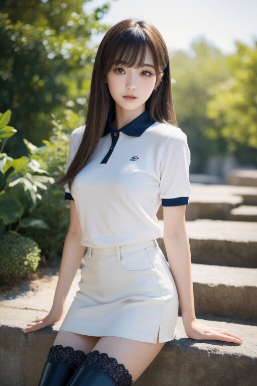 8k, 16k, highres, masterpiece, hyper illustration, illustration background, insanely detailed, detailed skin, blurry background, depth of field, natural light, soft lighting, good hands, BREAK Japanese woman, 23yo, (cute:1.1), (pretty:1.1), hyper detailed face, hyper detailed eye, beautiful eye, medium hair,(bangs:1.1), thin, tall,170cm tall, short skirt, polo shirt, thigh boots, hyper detailed, extremely detailed,