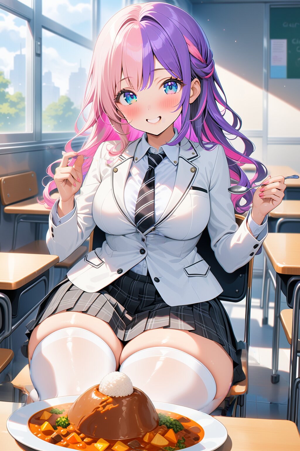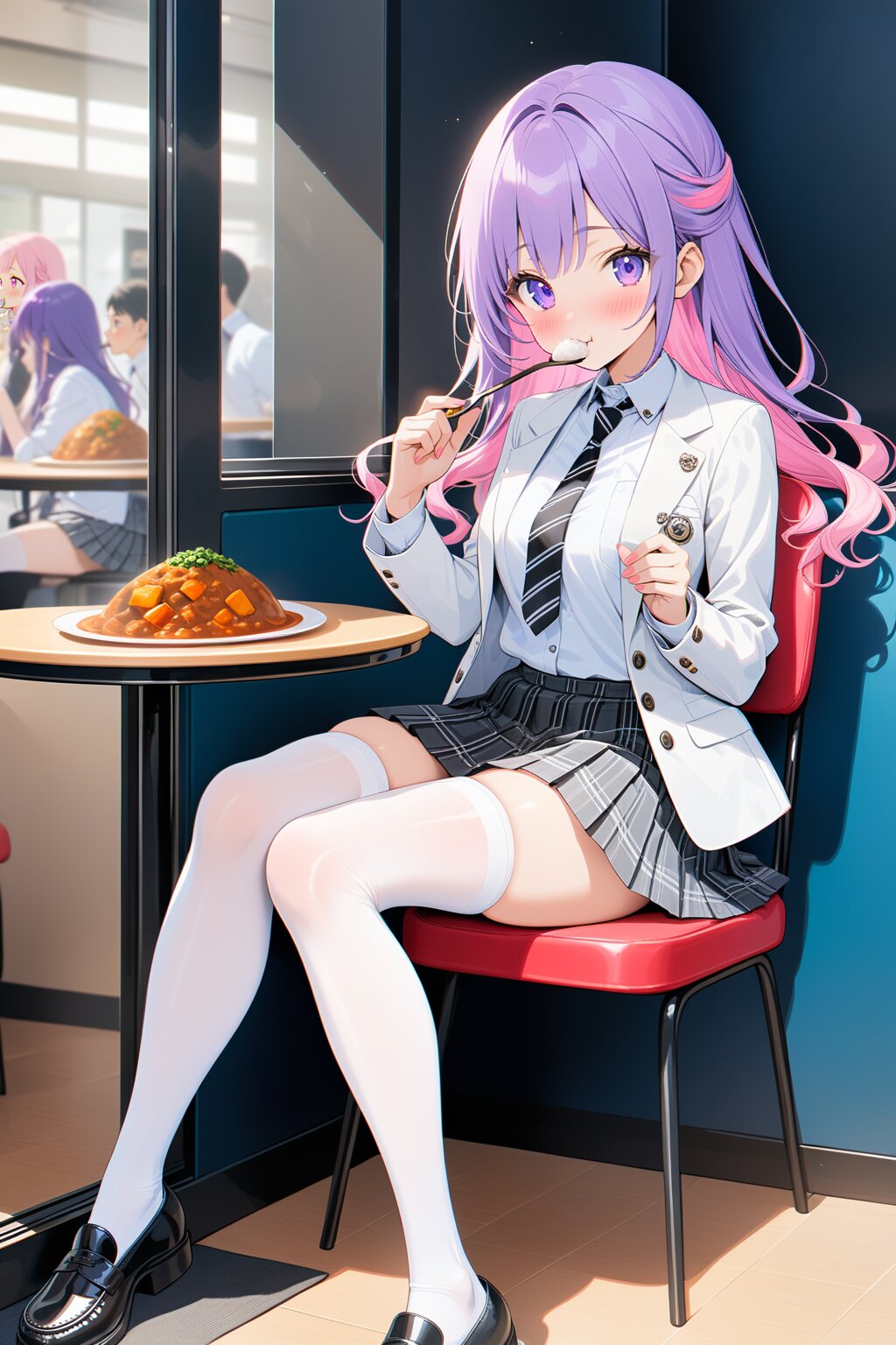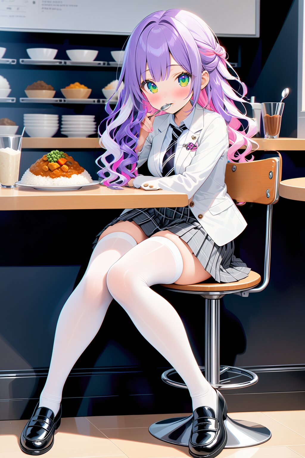 (full body:1.4), 1girl, (kawaii:1.5), solo, looking at viewer, ((holding spoon:1.2), eating, curry, plate, rise, (eat curry rice:1.3):1.5), sitting in chair, ((inside school cafeteria:1.5), (school cafeteria:1.4), daytime), ((split-color hair:1.5), ((purple hair:1.3), (pink hair:1.3)):1.3), (two-tone hair:1.2), (long wavy hair:1.5), bangs, (black hair:-1), (white hair:-1), (blue eyes:1.2), japanese girl, (medium breasts:1.3), (curvy:1.3), (voluptuous:1.2), (muscular:-1), (shiny skin, gleaming skin:1.4), (smile:1.3), blush, BREAK (Ivory-white theme:1.4), (Ivory-white blazer:1.4), (school uniform:1.2), (long sleeve:1.2), (white shirt:1.3), (white thighhighs:1.2), BREAK (black and white theme:1.2), (black and white stripes tie:1.3), (black and white tartan-check pleated skirt:1.2), BREAK (black loafers:1.2), ((8k, masterpiece ,best quality ,ultra-detailed)), game cg, masterpiece, (perfect face:1.1025), (perfect hands:1.1025), (perfect legs:1.1025), (perfect arms:1.1025), (perfect fingers:1.1025), <lora:xl_more_art-full_v1:0.6> <lora:add-detail-xl:1> <lora:Fixhands_anime_bdsqlsz_V1:1>