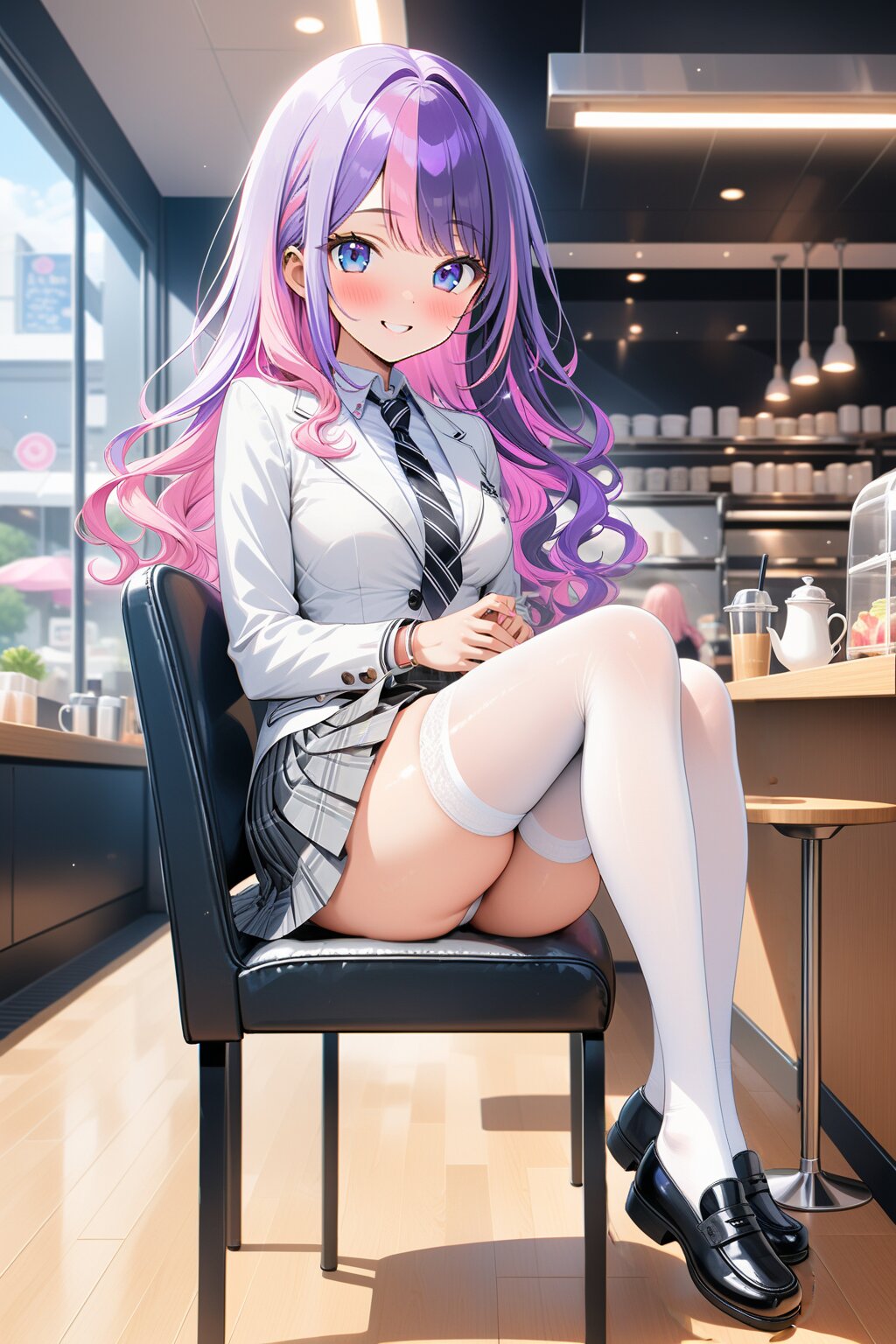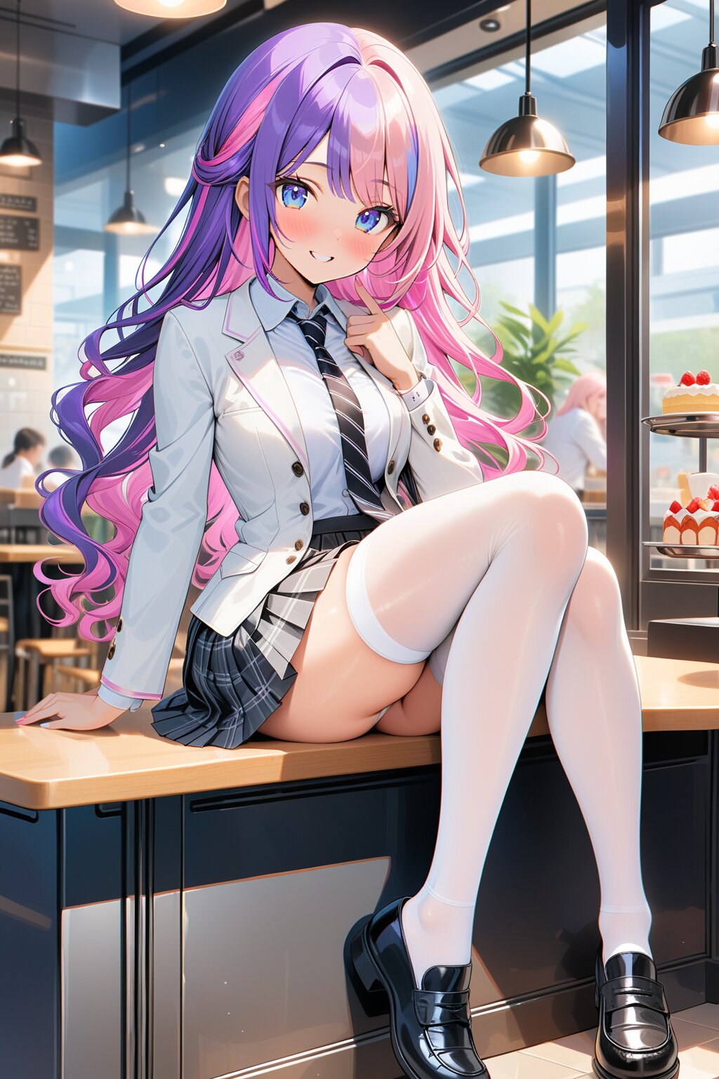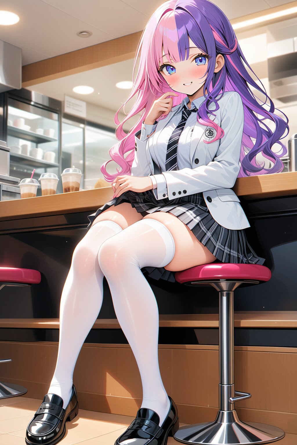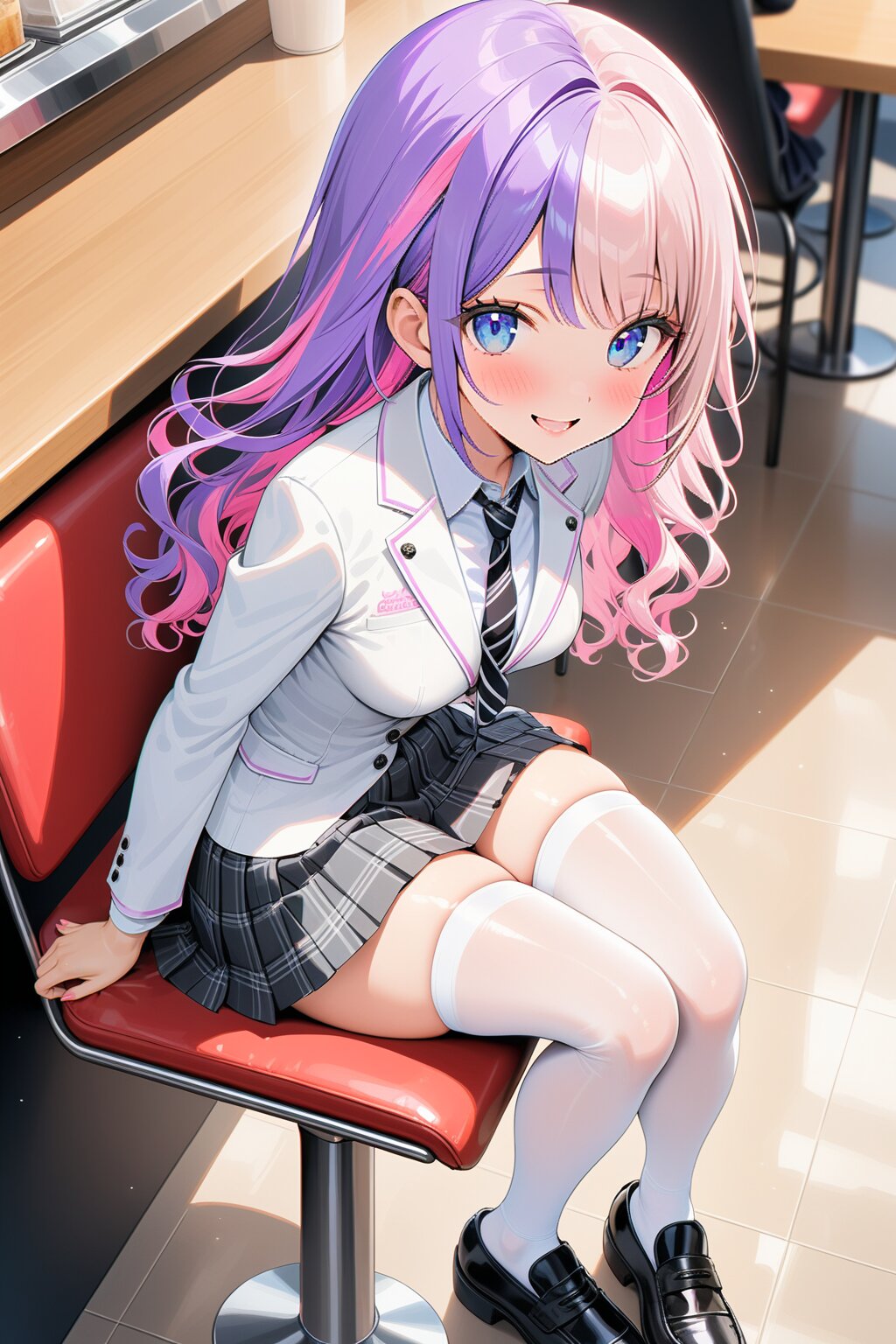 (full body:1.4), 1girl, (kawaii:1.5), solo, looking at viewer, ((holding spoon:1.2), eating, curry, plate, rise, (eat curry rice:1.3):1.5), sitting in chair, ((inside school cafeteria:1.5), (school cafeteria:1.4), daytime), ((split-color hair:1.5), ((purple hair:1.3), (pink hair:1.3)):1.3), (two-tone hair:1.2), (long wavy hair:1.5), bangs, (black hair:-1), (white hair:-1), (blue eyes:1.2), japanese girl, (medium breasts:1.3), (curvy:1.3), (voluptuous:1.2), (muscular:-1), (shiny skin, gleaming skin:1.4), (smile:1.3), blush, BREAK (Ivory-white theme:1.4), (Ivory-white blazer:1.4), (school uniform:1.2), (long sleeve:1.2), (white shirt:1.3), (white thighhighs:1.2), BREAK (black and white theme:1.2), (black and white stripes tie:1.3), (black and white tartan-check pleated skirt:1.2), BREAK (black loafers:1.2), ((8k, masterpiece ,best quality ,ultra-detailed)), game cg, masterpiece, (perfect face:1.1025), (perfect hands:1.1025), (perfect legs:1.1025), (perfect arms:1.1025), (perfect fingers:1.1025), <lora:xl_more_art-full_v1:0.6> <lora:add-detail-xl:1> <lora:Fixhands_anime_bdsqlsz_V1:1>