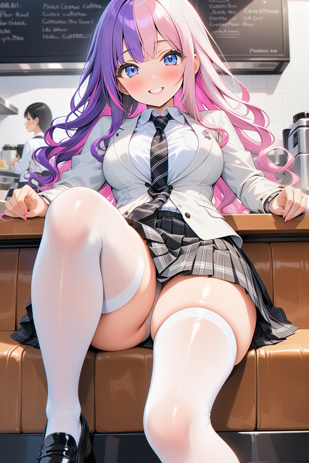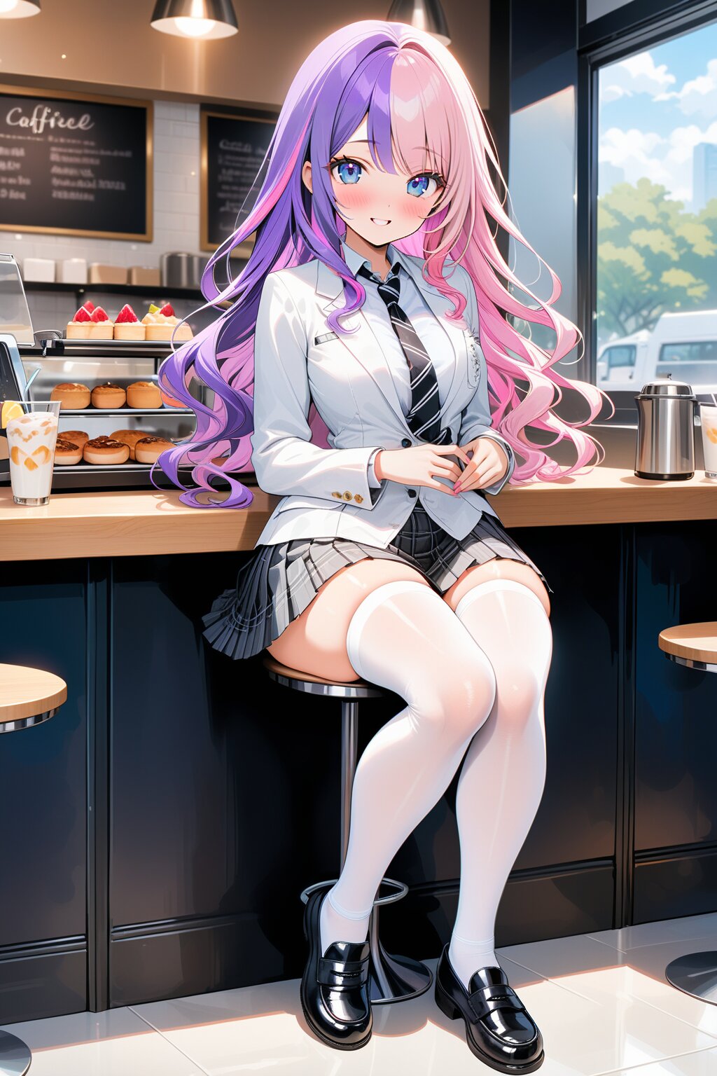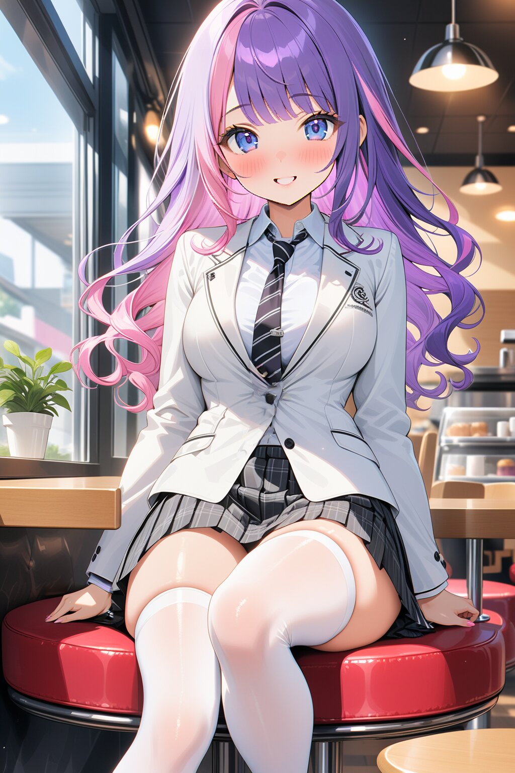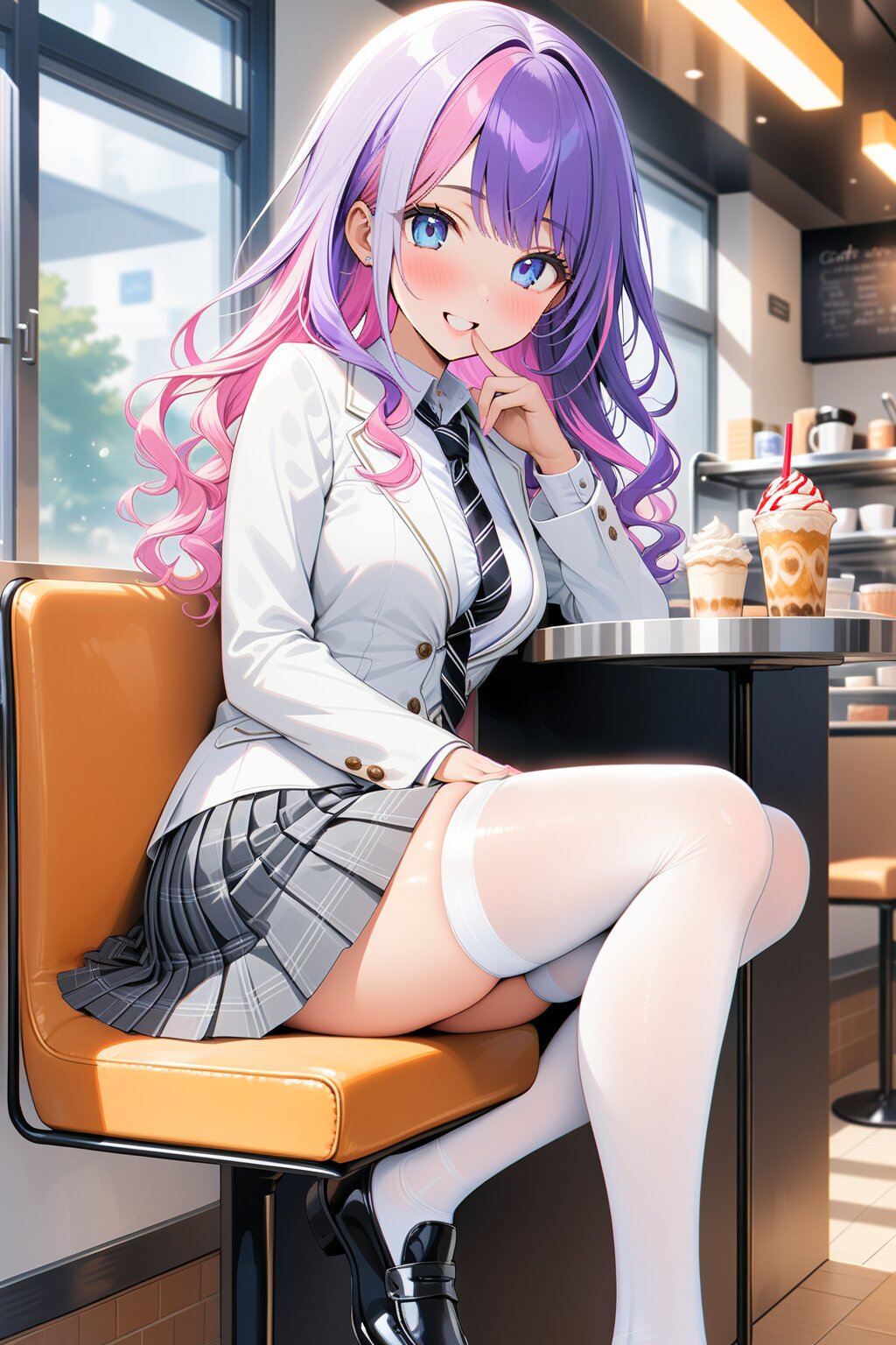 AIイラスト生成で最近好きになったモデルの ChromaXL v1b でIRIAM配信者さんのアバターを基にブレザー制服で校内のカフェテリアでくつろぐ姿をAI画像生成しました