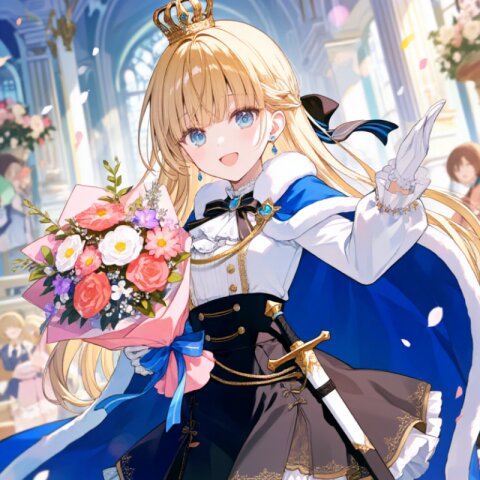 solo, a very cute chibi brown anime bear with small eyes, a delicate face, and detailed hair stands in a (Dark Khaki luxurious Prince costume:1.6) with long sleeves, a (luxurious Navy purple Cape:1.3), and a (mini skirt with white frill:1.4). The bear has (Teddy Bear hands:1.2) and wears (Black luxurious Boots:1.3), with a (Dagger on waist:1.3) and a (luxurious crown on head:1.4). The background features a grand Palace with Rococo architecture, romantic academia styling, and an outside setting filled with flowers at night. The atmosphere is magical, with soft glowing lights and blooming flowers enhancing the scene. The style of the image is insanely detailed, beautiful, and rendered in a 16k masterpiece quality, focusing on the bear's cute pose and the luxurious, royal aesthetic.