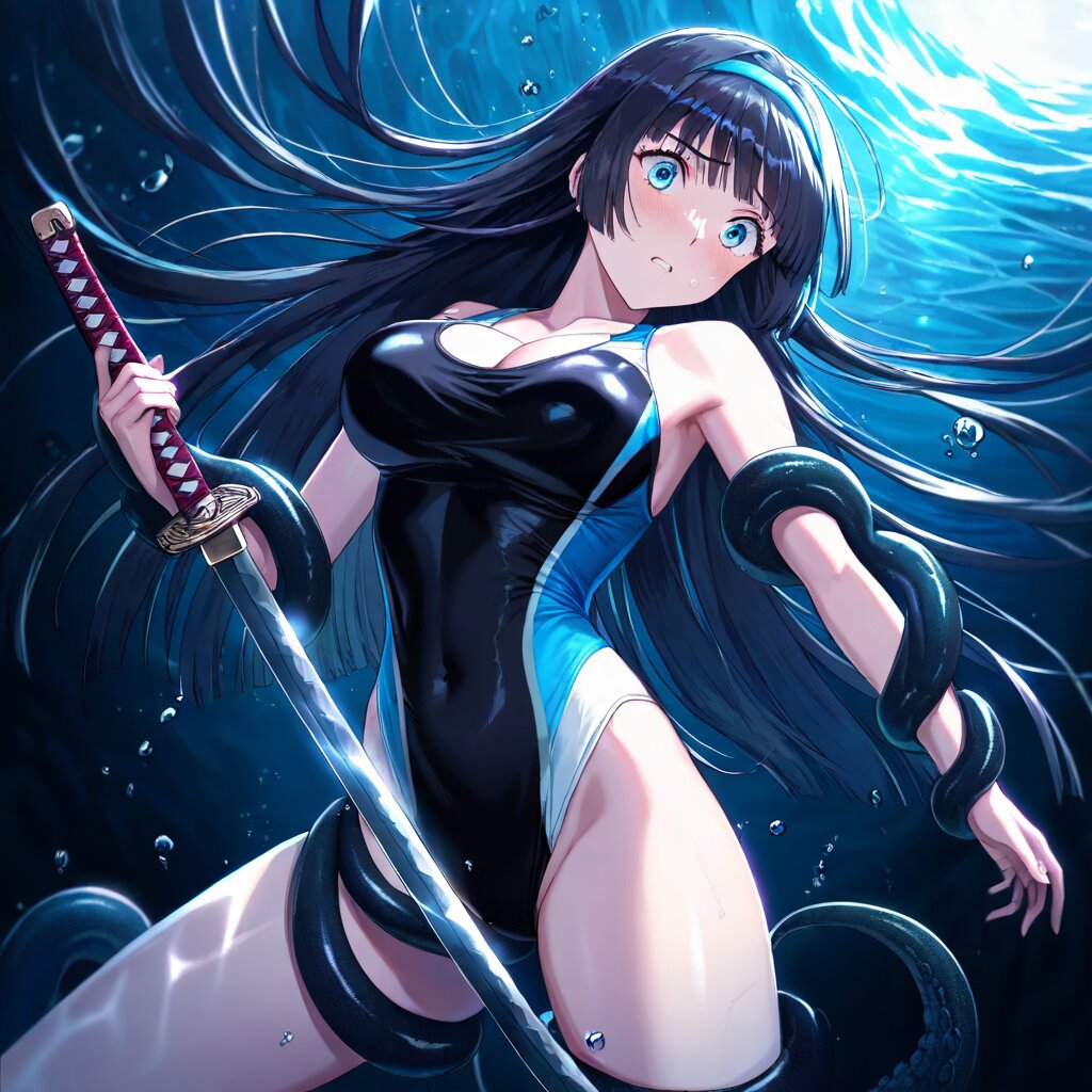 ((masterpiece)), ((best quality)), (ultra-detailed), anime style,cowboy shot, dark cave,underwater, submerged,a cute girl, 1girl, large bust ,Tentacles entangled her body,(Black Racing-style swimsuit), beautiful black hair, ((beautiful eyes)),straight hair, (blunt hair), ((blue hairband)), (drifting underwater),on back,head down,horrified,screaming,painful face, Holding a weapon in hand, gripping katana