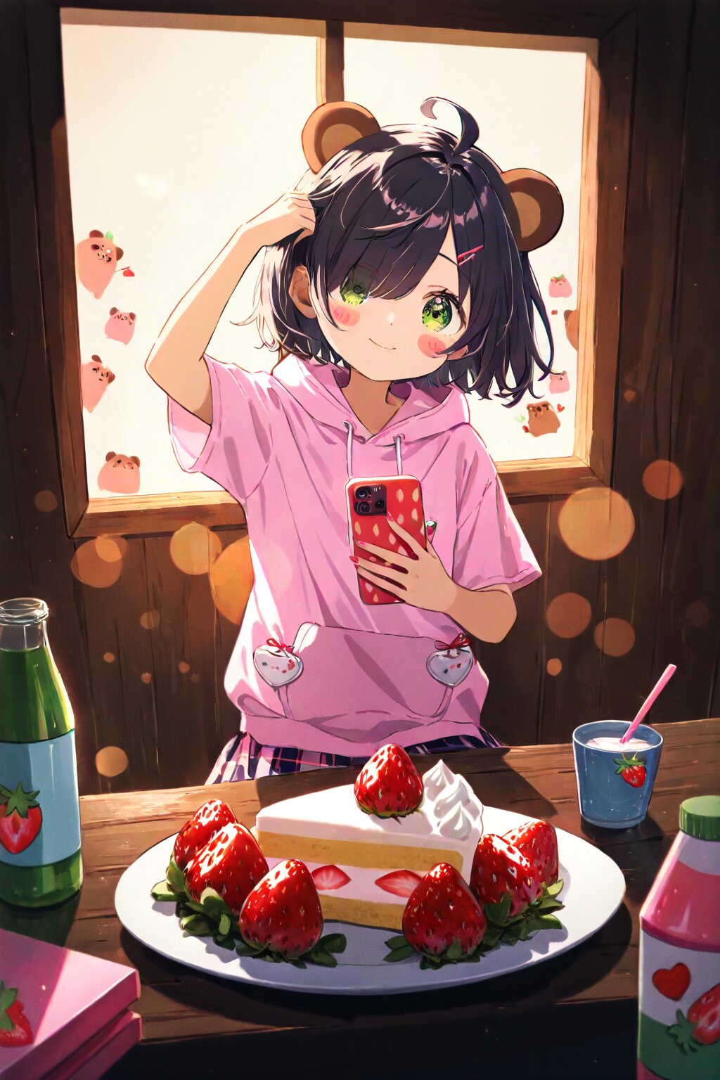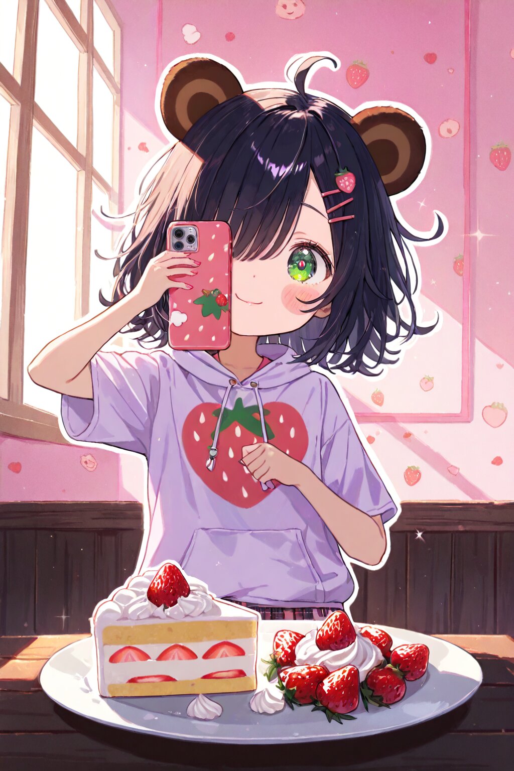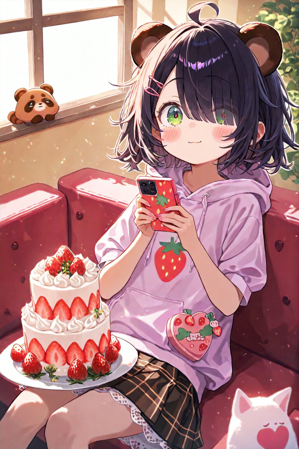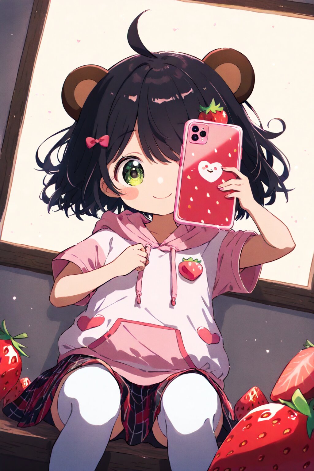 masterpiece, best quality, absurdres, highres, ultra detailed, perfect anatomy, (Make the outline thicker:1.2) (1girl,solo:1.3),(girl with tanuki ears:1.3), (ahoge1.3), pink purple mesh, (asymmetrical long bangs over one eye covered and eyes visible through hair short:1.3), disheveled hair, messy hair, (fine green eyes, Purple pupils, beautiful black hair:1.3), (child, loli:1.7), (blush, timid expression:1.3), half-tearful eyes, multiple hairpins, Her hair is studded with small ribbons and pins. dreamy girl with sits with a slouched posture in a cozy corner of an abandoned strawberry-themed café. She’s completely absorbed in her strawberry-patterned smartphone, held up close to her face, dominating the foreground of the scene. The camera focuses tightly on her fingers—nails painted with tiny strawberries—as they tap gently across the glossy screen, which reflects faint berry motifs and glitter stickers. She wears an oversized pastel pink short sleevehoodie with embroidered strawberries and soft white lace, paired with a plaid skirt that has subtle berry print. Her stockings are mismatched, one adorned with a strawberry milk carton print, the other with tiny repeating berry icons. A fluffy strawberry-shaped keychain dangles from her hoodie pocket, swaying with her subtle movements. The air is scented with sugar, hinted by half-eaten strawberry shortcake on a plate beside her, and a glass bottle of strawberry soda fizzing gently. The background is full of strawberry references—red berry garlands strung along the walls, faded posters advertising seasonal parfaits, and a tablecloth patterned with tiny strawberries and whipped cream swirls. Soft pink ambient lighting mixes with natural afternoon sunlight streaming through the window, creating warm highlights on her cheeks and casting long shadows behind her. Her expression is focused and content, lips slightly curved upward in a gentle smile, her head tilted as she scrolls through messages filled with heart and berry emojis. She sits in a relaxed pose—knees tucked up, one hand lazily propping up her head, the other holding the phone close to her face. Her gaze is intensely locked onto the phone, creating a sense of intimacy and absorption. Around her, strawberry stickers are scattered across the wooden tabletop, and her bag, partially open, reveals a strawberry-print notebook and a strawberry-scented pen. The camera angle is a medium-close shot, slightly above and tilted downward, capturing her expressive face, the glowing screen of the phone, and strawberry motifs scattered in both foreground and background. The soft, shallow depth of field makes the berries pop even more against the blurred background. masterpiece, best quality, ultra-detailed, high resolution, 8k wallpaper, ambient light, strawberry café, strawberry-pattern clothes, strawberry-themed phone, cute girl, expressive face, tanuki ears, ahoge, messy hair, disheveled hair, fine green eyes, lace hoodie, cozy environment, cinematic lighting, focus on phone, soft light, gentle atmosphere, strawberry shortcake, strawberry soda, pastel tones, backlight, dynamic composition, decorated setting, realistic texture, layered background <lora:xl_more_art-full_v1:0.5><lora:cutedoodle_XL:0.3>