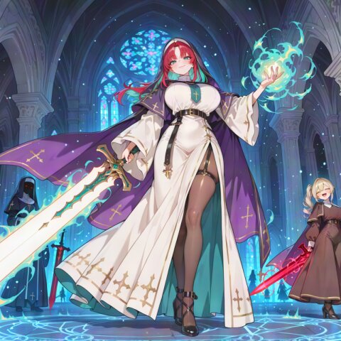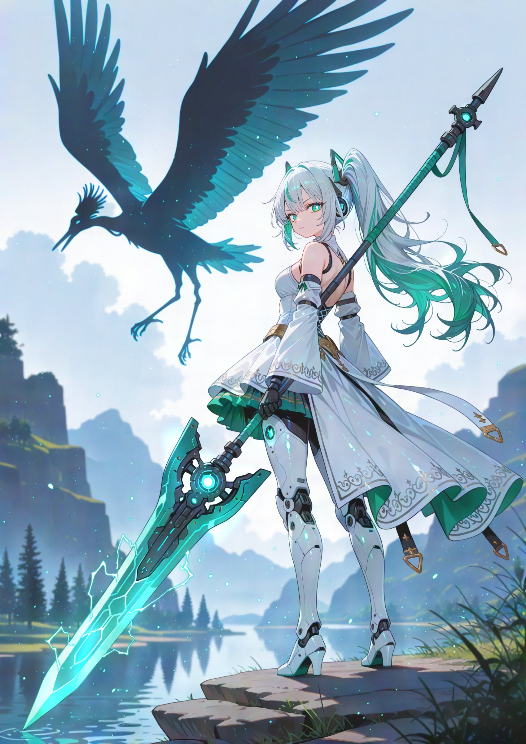 1girl, huge cool polearm in hands, holding huge cool weapon mechanism, machine, Over the Shoulder Shot, looking back, long shot, (blurry foreground:0.0) (25 years old:1.0), (medium breasts:1.2), (two-tone hair, grey and ever green hair, shoulder length hair, high side ponytail medium bangs:1.0), (beautiful face:1.1), (clear white small eyes:1.0), green pupils , fighting stance, weapon over shoulder, (mechanical black hands:1.0), black robot ears, , (mechanical white legs:1.1), white mechanical thighs, neon trim, medieval times fantasy world, (cybernetic gynoid:1.0), (mech suit:1.0), (white gothic cuirass:1.0), (robot joints:1.0), (white gorgeous modest wizard's dress skirt:1.1), , glossy silver body with metallic luster cyborg, bare shoulders, (Decorative embroidery:1.0), (white gorgeous dress:1.1), (overskirt:1.0), (white sleeve:1.2), electrokinesis, (looking away:1.0), from side, (huge indigo silhouette of Heron,serious monster silhouette:1.2), Majestic Scottish landscapes with rugged mountains, lakes, and mystical mists., blurry background, super fine concept art, hard surface, 8K, masterpiece, best quality, amazing quality, very aesthetic, absurdres, professional art lots of details, , overexposure, shiny-glistening, (watercolor style:0.0), (pastel color style:0.5) 4ur4_illu,shiny, glowing, glowing particles, glowing light particles, light particles, <lora:noline (1):1.0> <lora:sdxl2-flat2-512b:0.15> <lora:facelightup_xl_v10:0.5> <lora:V2_yakumo_alchemy:0.5> <lora:Aura_illu:0.1>