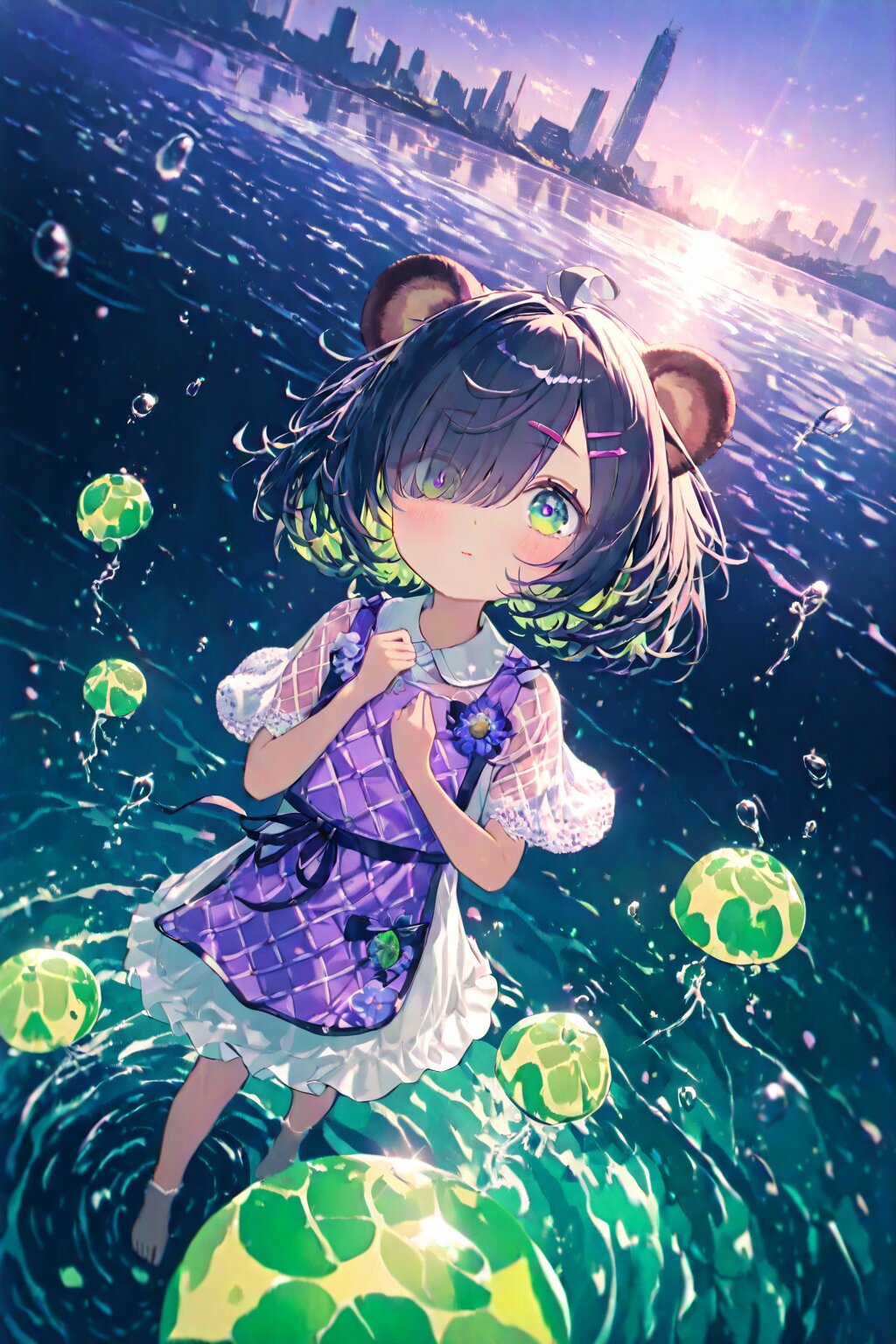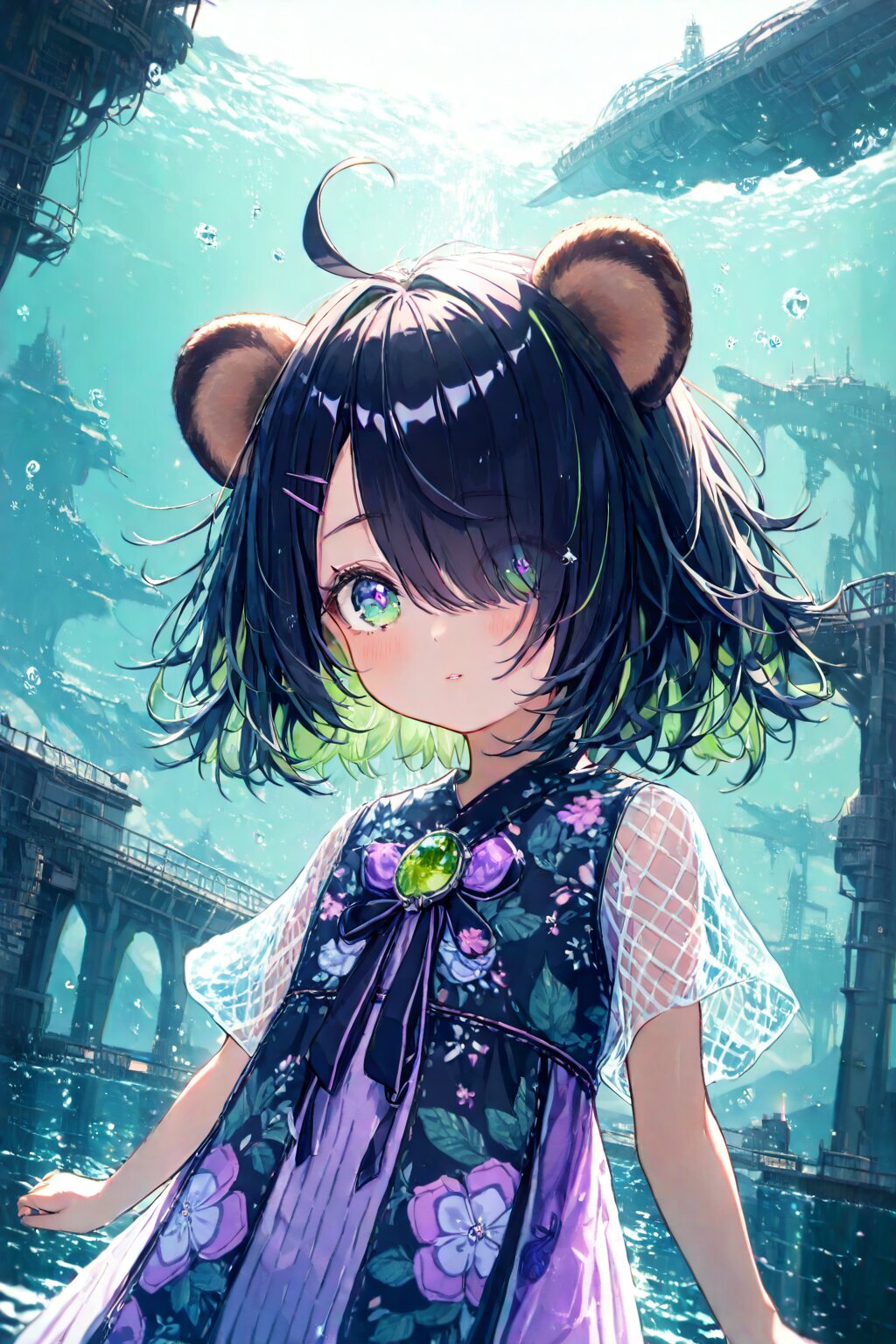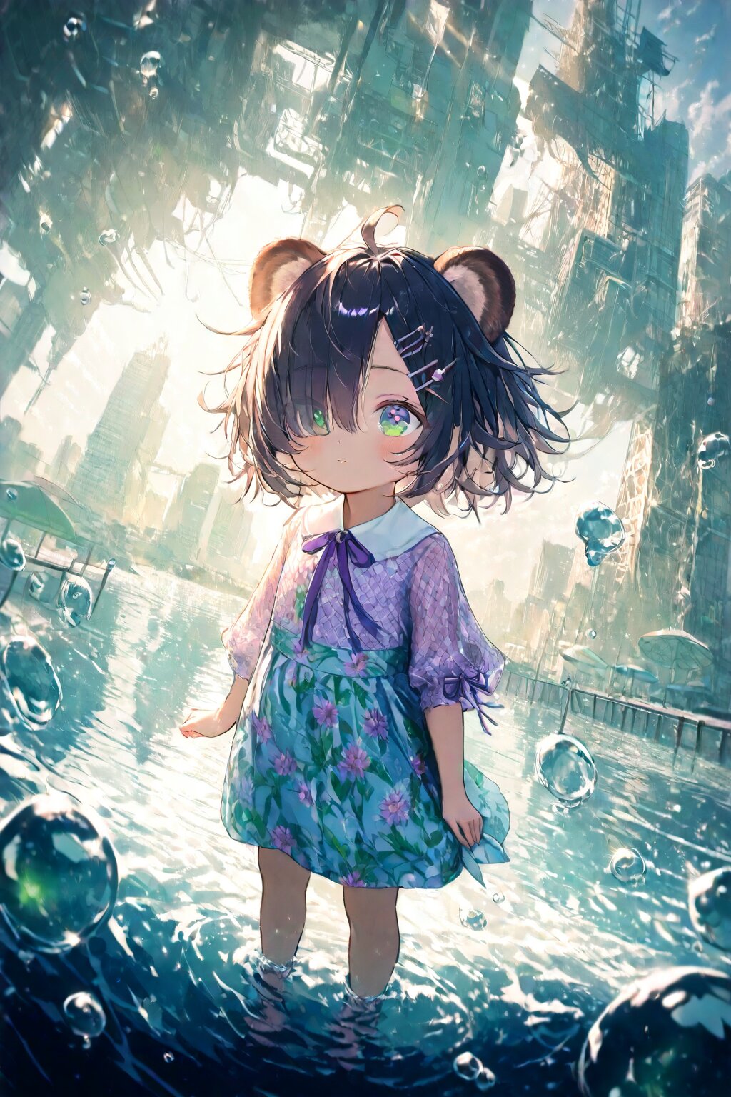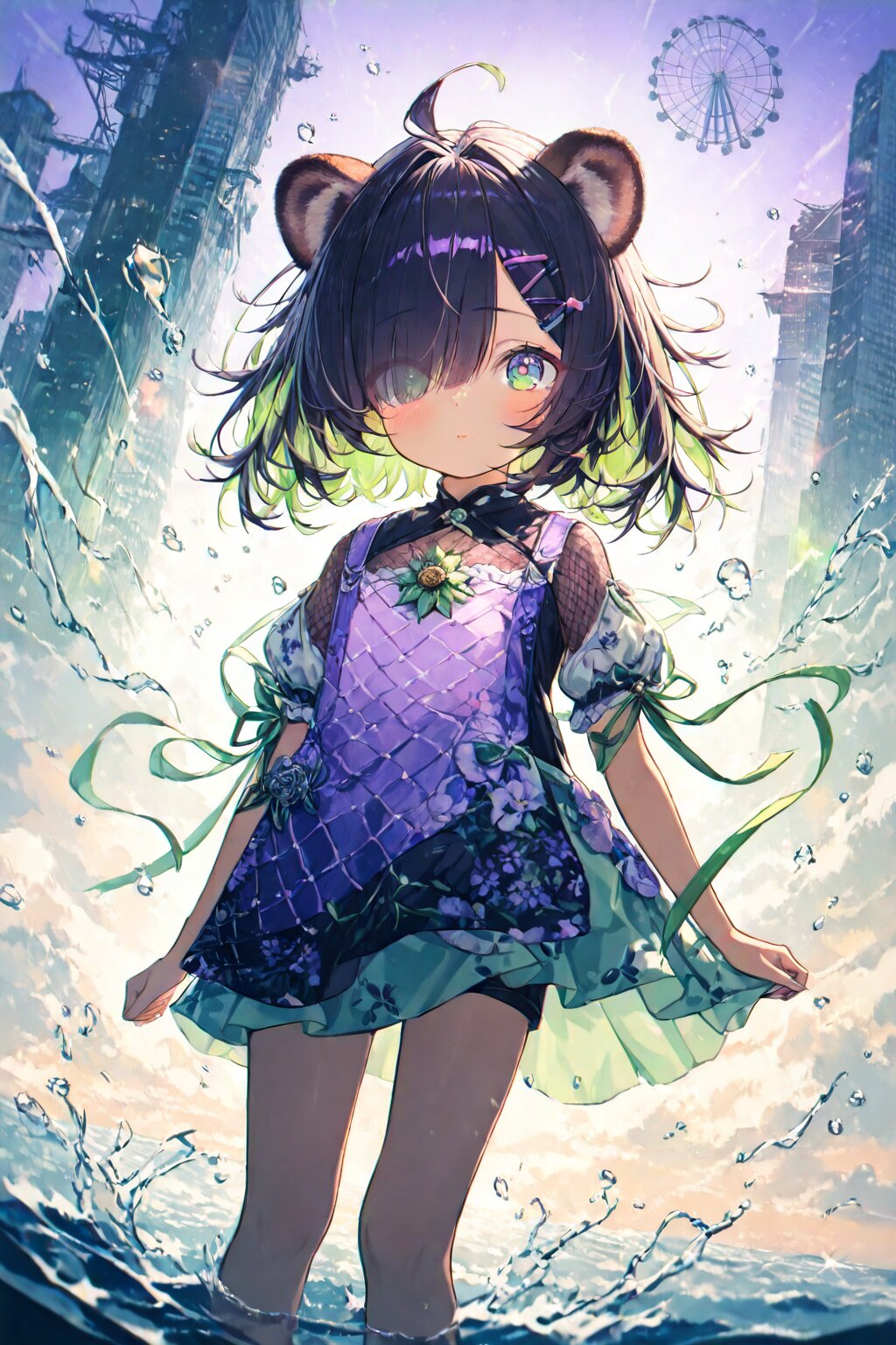 masterpiece, best quality, absurdres, highres, ultra detailed, perfect anatomy, harmonious moment, (Thick coating:1.2), (1girl,solo:1.3), (girl with tanuki ears:1.3), (ahoge1.3), pink purple mesh, (asymmetrical long bangs over one eye covered and eyes visible through hair short:1.3), disheveled hair, messy hair, (fine green eyes, Purple pupils, beautiful black hair:1.3), (child, loli:1.7), blush, multiple hairpins, Her hair is studded with small ribbons and pins. girl with tanuki ears, messy disheveled hair and a single ahoge strand gently swaying in sea breeze, fine green eyes glimmering under scattered neon reflections. she wears a summer-themed maid outfit adorned with translucent frills, floral embroidery, sunflower brooch, and hydrangea-patterned apron, trimmed with seashell motifs and tied at the back with a loose ribbon. soft lighting dances across her slightly tanned skin, suggesting a humid yet breezy atmosphere. she stands barefoot on a rusted, tilted rooftop of a half-submerged skyscraper, deep in a post-apocalyptic, ocean-flooded megacity. the horizon stretches behind her, revealing broken towers swallowed by the calm, glowing water. jellyfish float in the depths below. abandoned monorail tracks pierce through the mist in the distance, glowing faintly. the sky is twilight blue, studded with distant city lights trapped underwater, casting eerie reflections. a sunken Ferris wheel looms faintly in the background. the air is heavy with moisture and electricity, and cicadas cry in the background. her expression is melancholic but resolute, lips slightly parted, eyes fixed downward toward the submerged city, lost in thought. she holds a soaked, old parasol in one hand, tilted against the breeze. her other hand rests gently on her chest as if recalling a memory. low-angle shot, cinematic composition with soft depth of field, lens flare, and atmospheric perspective. background slightly desaturated, character vivid. shallow depth focus enhances her silhouette against a neon-lit mist. ultra-detailed, masterpiece, best quality, 8k, highres, RAW photo, subsurface scattering, photorealistic lighting, ambient occlusion, ray tracing reflections, volumetric light, depth of field, cinematic color grading, dramatic shadows, ultra realistic eyes, intricate fabric detailing, dynamic pose, dramatic atmosphere. <lora:xl_more_art-full_v1:0.5><lora:cutedoodle_XL:0.3>