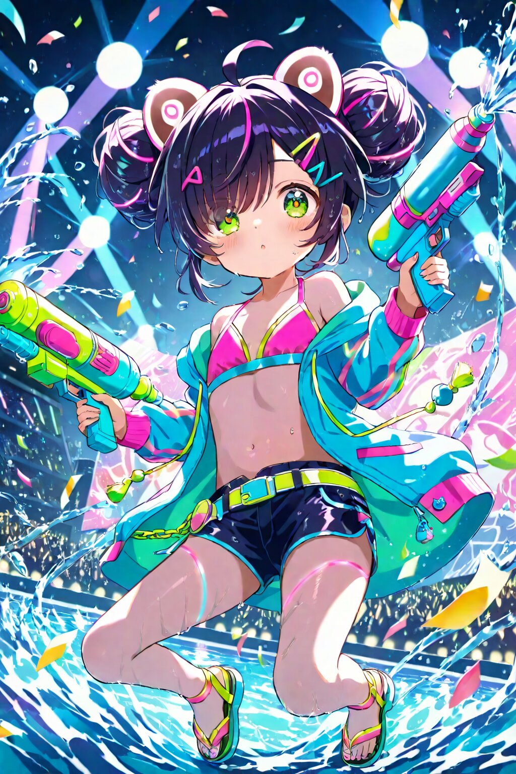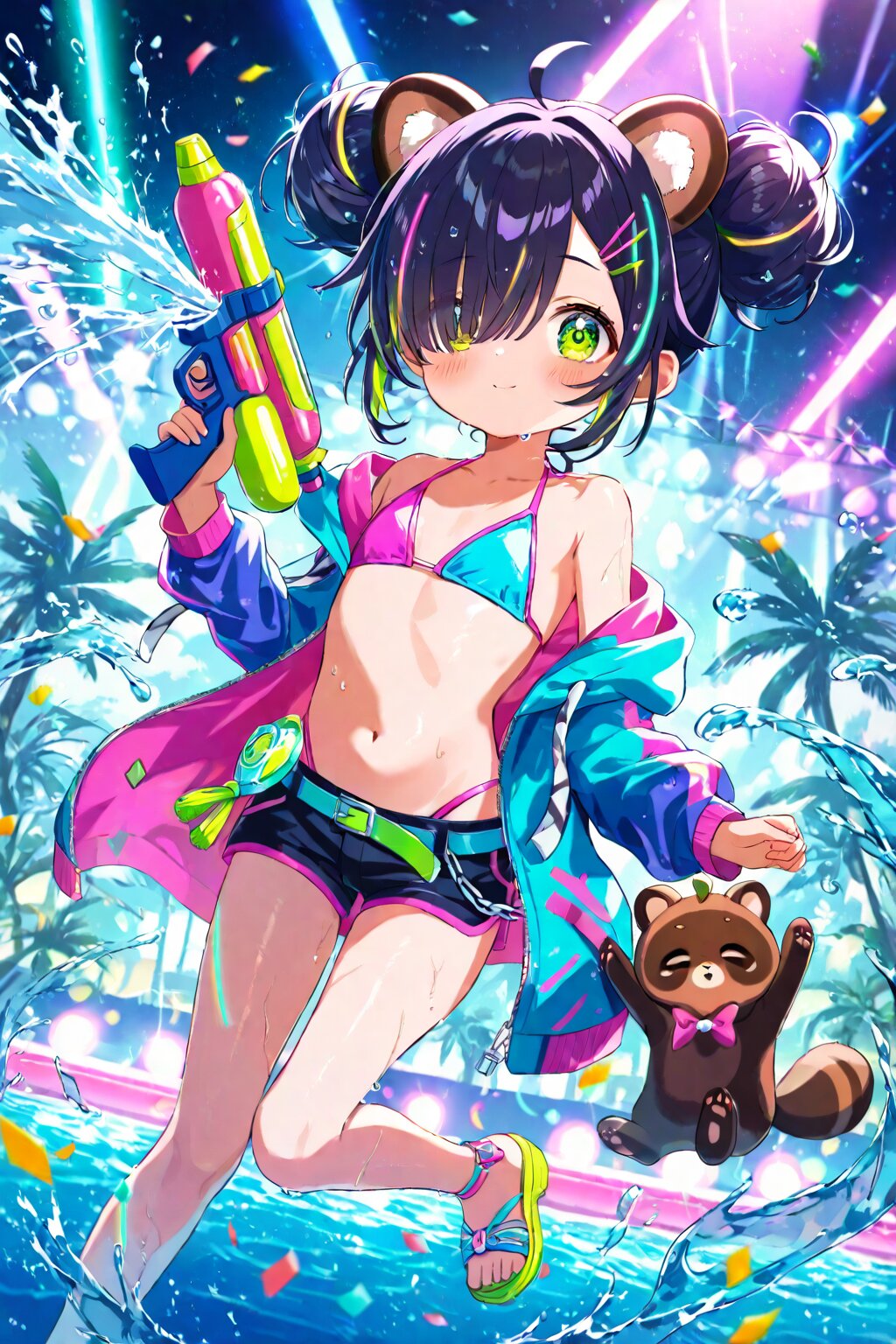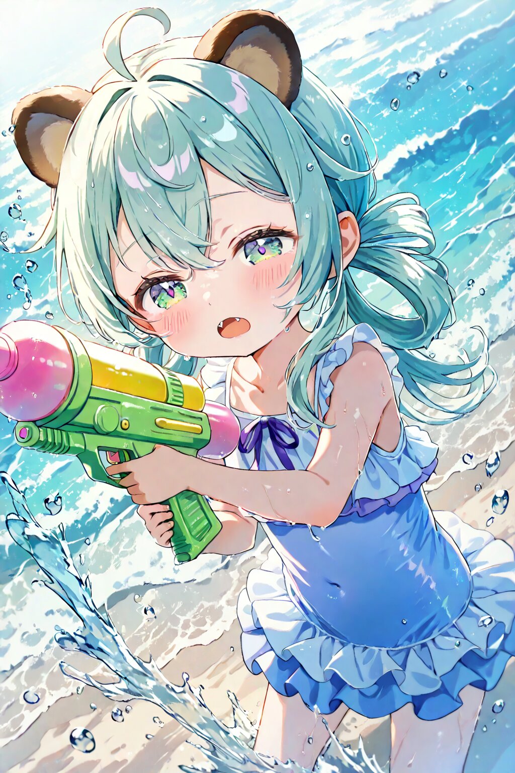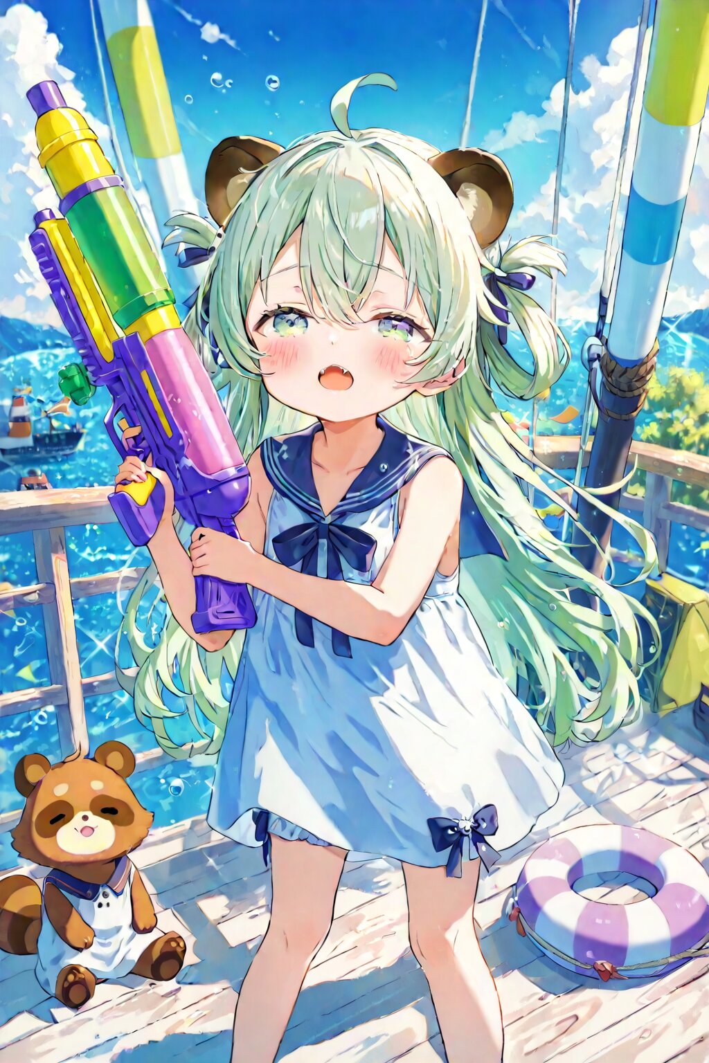 masterpiece, best quality, absurdres, highres, ultra detailed, perfect anatomy, harmonious moment, (Thick coating:1.2), (girl with tanuki ears:1.3), (ahoge, hair rings:1.3), (Hair between eyes falls down to shoulders:1.3), long hair, smooth hair, (fine green eyes, Purple pupils, beautiful white Light green silver hair:1.3), (child, loli:1.7), (blush, Sleepy eyes, sleepy expression:1.2), Fangs, half-closed eyes, A colorful illustration, wearing a sailor-inspired (bikini:1.2) with navy collar and ribbon, holding a playful water gun, standing on the wooden deck of a large ship with white railings, ropes and lifebuoys, tall mast and sails in the background, bright sunny sky and sparkling ocean -- pose, hairstyle, expression and action are free <lora:xl_more_art-full_v1:0.5><lora:cutedoodle_XL:0.3>