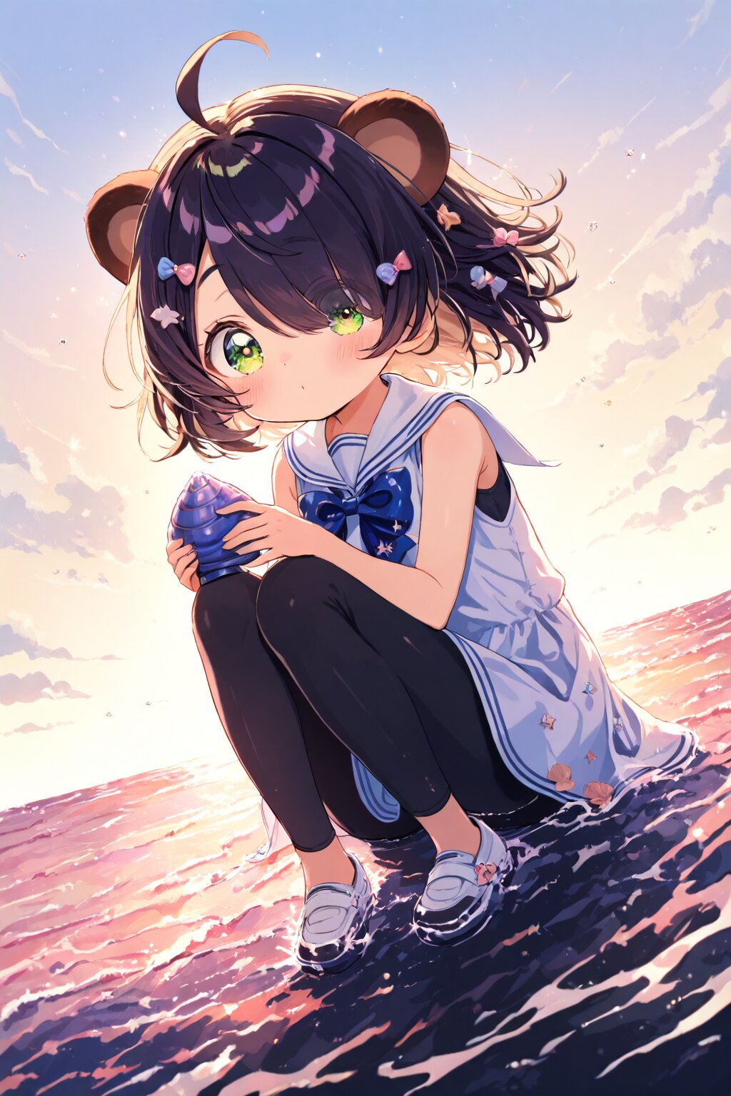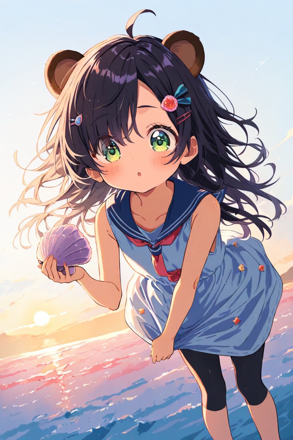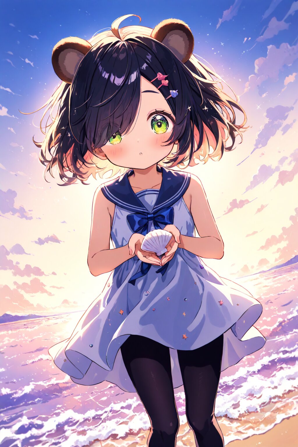 (girl with tanuki ears:1.3), Highlight the girl, (ahoge1.3), pink purple mesh, (asymmetrical long bangs over one eye covered and eyes visible through hair short:1.3), disheveled hair, messy hair, (fine green eyes, Purple pupils, beautiful black hair:1.3), (child, loli:1.7), blush, multiple hairpins, Her hair is studded with small ribbons and pins. An adorable 6-year-old girl with long, braided chestnut hair adorned with a blue bow, wearing a sleeveless navy-blue sailor dress with a white collar and red tie, paired with black spandex leggings, standing in a simple coastal meadow at dusk with the warm glow of a summer sunset. She’s clutching a small seashell in her hands, her expression radiant with curiosity and delight, her big eyes sparkling as she gazes slightly downward at the shell. Her posture is playful, slightly crouched as if examining her treasure closely. The camera angle is a medium shot, capturing her from the knees up, with the soft orange and pink hues of the sky in the background. masterpiece, best quality, absurdres, highres, ultra detailed, perfect anatomy, harmonious moment, (Thick coating:1.2), White background, blank background <lora:xl_more_art-full_v1:0.5><lora:cutedoodle_XL:0.3>