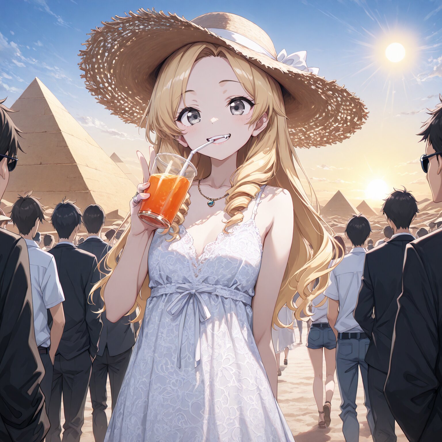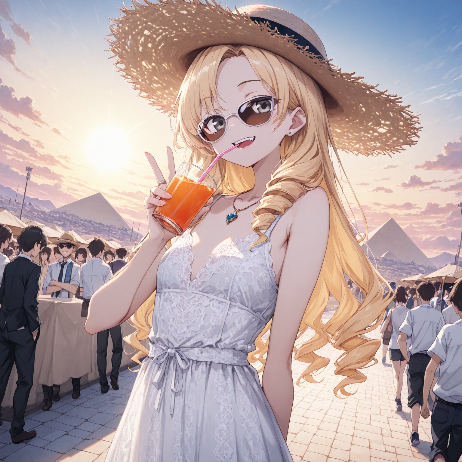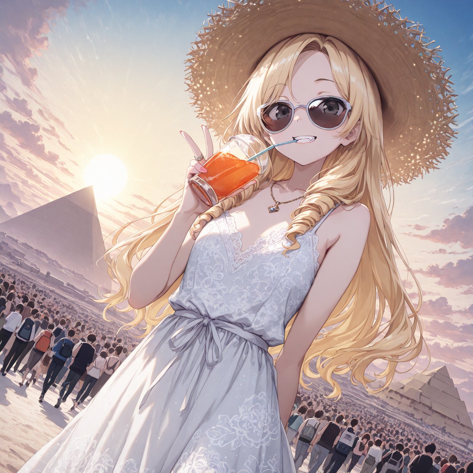 (1girl), young female, BREAK, Blonde, long hair, (drill hair), (left-parted bangs:1.4),, silver eyes, pale skin, long fangs, flat chest, small breasts, gorgeous, elegant, ring, necklace Smirking, smiling BREAK,Large-brimmed hat, sunglasses, lace dress, Holding a straw in the mouth, drinking juice, holding juice, V, peace sign Desert, pyramids, pyramids in the background, walking crowds Clear weather, sun, tourist spot, crowds of tourists BREAK, (newest, anime, animation, anime screen capture, anime style:1.3) BREAK, (masterpiece, , vibrant, very aesthetic, highly detailed, best quality, 16k:1.3)