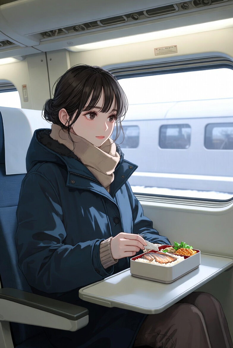 日本人女性28歳のイラスト。冬服の仕事着で東海道新幹線の座席に座っている。駅弁を食べようとしている。