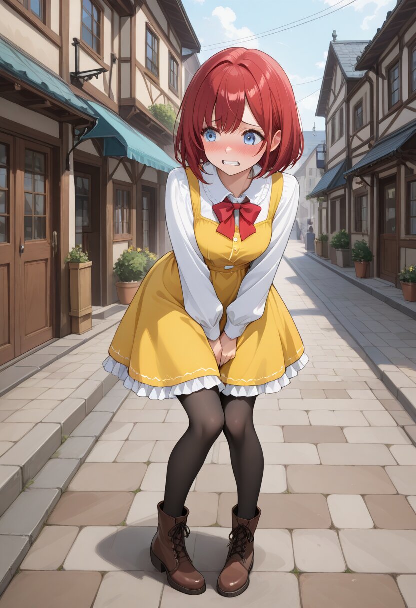 1girl, original character, bob hair, red hair, anime style, white shirt, long sleeves, yellow jumper miniskirt, yellow dress, red bowtie, ruffles, frilled hem, town, full body, brown boots, blue eyes, light blue eyes, black pantyhose, have to pee, looking ahead, original character, three quarter view, hands on crotch, through the skirt, knees together feet apart, pigeon-toed, leaning forward, blush, embarrassed, teeth, anime style