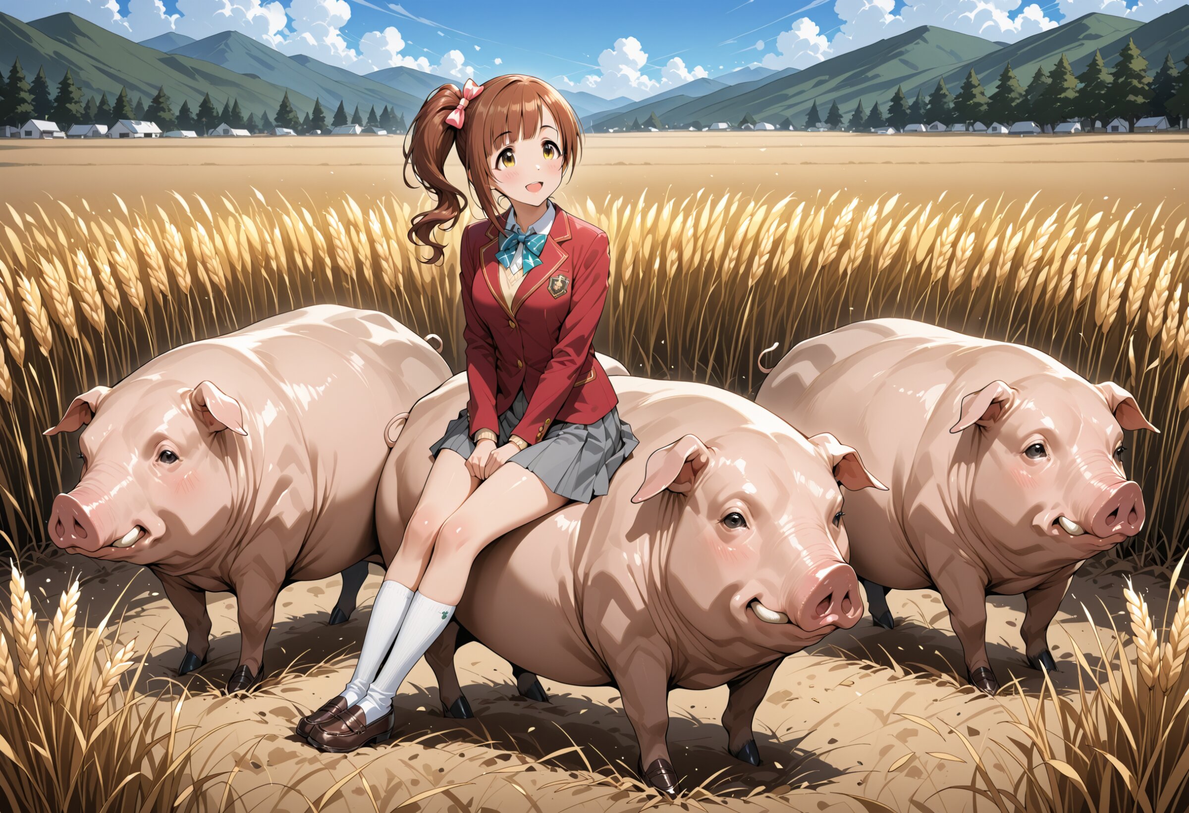High resolution, Super detailed, Best Quality, masterpiece, 8K, 4K, beautiful background, the best aesthetics, BREAK 1 girl, Igarashi Kyoko, The Idolmaster Cinderella Girls,yellow eyes,brown hair, uniform red blazer, white socks,full body,riding wear loafers, on white pig, BREAK wide pigsty,surroung many pigs,feed wheat,