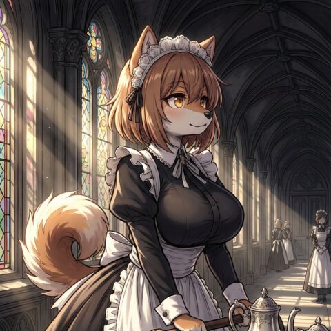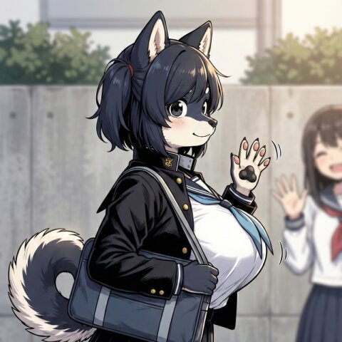 アスペクト比2:3の縦長の2Dイラストを生成する。強めの陰影とコントラスト。キャラクターの線は細く、薄くする。可愛らしい見た目。バストを長く、大きくする。体が小さい。肩が狭い。ヒップを大きくする。図1のキャラクターは黒柴犬のケモノで、黒い柴犬の耳と丸まった尻尾を持つ。柴犬の体毛がモフモフ。体毛と衣服の質感向上。キャラクターの特徴・髪色・瞳の色・毛色・髪型・表情・服装をそのままに、構図とポーズを変更する。赤いヘアゴムで結ばれた短いシングルサイドテール。服装は、開いた黒い学ラン、右胸にポケットの有る白いセーラー服、青いネッカチーフ、紺色のプリーツスカート、黒いハイソックス、白いスニーカーを追加。背景は図3の教室。立って、図2のキャラクターが表紙になっている雑誌を焦りながら見る。周りには女子の人影。大腿部の内側は白い毛、それ以外の脚の部分は黒い毛。完全に新しいイラスト。 ▶︎Good! 汗が三滴飛ぶ。丸まった尻尾を残像を出して振る。瞳に螺旋の白線を描く。バストを更に長く、大きくする。光沢を無くす。体毛と衣服の質感向上。小さい手書き文字で「(モロ、モロだ、コレ)」と胸中を表す様に顔の隣に書く。