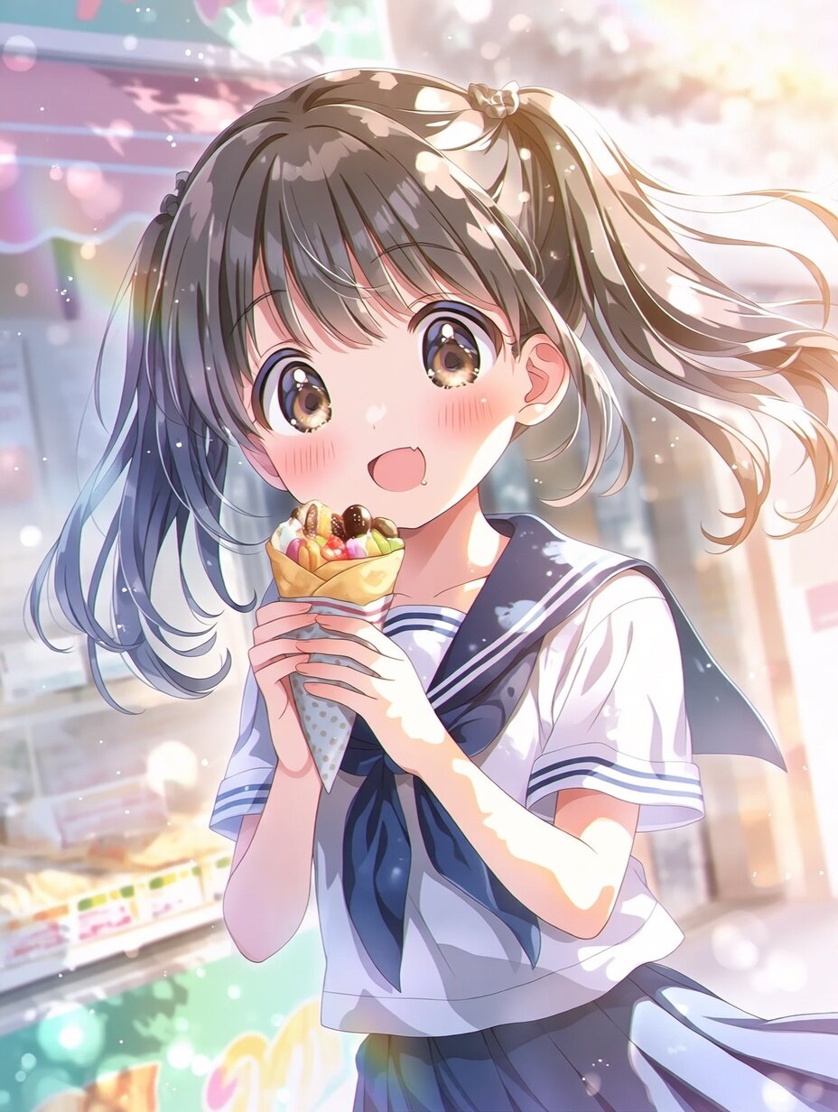 (masterpiece, best quality, highres, 8k wallpaper:1.2), extremely detailed, insanely detailed, (ultra-detailed eyes, sparkling eyes:1.1), (soft lustrous skin), beautiful young girl, bishoujo, bright and cheerful presence, pure and lively charm, twin-tail hairstyle, soft and bouncy with light movement, glossy hair strands catching the light, long eyelashes, large expressive eyes filled with joy, rosy cheeks, radiant smile, youthful innocence, wearing a classic sailor uniform, clean white and navy color scheme, neatly tied ribbon, slightly fluttering skirt adding cuteness and motion, happily holding a crepe, colorful and delicious-looking, wrapped in paper, filled with cream, fruits, or chocolate, eyes sparkling with excitement, small delighted expression as if she just took a bite, conveying simple everyday happiness, (cinematic lighting), (soft focus), warm daylight that flatters the skin and enhances sweetness, gentle diffused glow, tyndall effect, bloom, soft rim lighting outlining hair, shoulders, and crepe, (glowing light:0.8), dynamic yet natural pose, slight forward lean showing excitement, depth of field, rule of thirds, looking toward the viewer with an innocent, joyful gaze, background: casual street or shopping area, crepe stand nearby, pastel storefronts, soft signage, gentle crowd blur, sunlit atmosphere, floating light particles, creamy bokeh, transparent and airy feeling, slice-of-life anime-style digital illustration, wholesome and heartwarming mood, youth and happiness theme, cute and refreshing composition, emotionally uplifting, high-quality commercial illustration style
