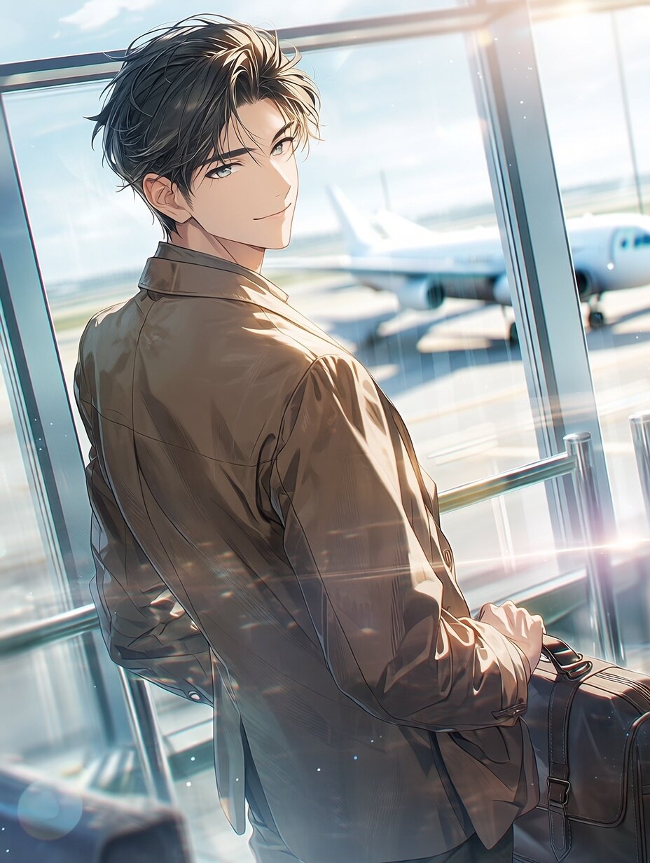 (masterpiece, best quality, highres, 8k wallpaper:1.2), extremely detailed, insanely detailed, (ultra-detailed eyes, sparkling eyes:1.1), (soft lustrous skin), beautiful young man, bishounen, refined and calm presence, gentle yet confident aura, short black hair, neatly styled with a natural texture, slightly tousled ends, long eyelashes subtly emphasized, clear expressive eyes with a quiet determination, smooth pale skin, elegant jawline, perfectly balanced proportions, wearing a brown jacket, tailored and stylish, soft fabric texture with realistic folds, paired with brown trousers, clean and modern silhouette, black leather shoes, polished and high-quality, neat and refined styling, holding a travel Boston bag, leather or canvas material, practical yet fashionable, suggesting departure and adventure, (cinematic lighting), (soft focus), bright yet gentle airport lighting, soft diffused glow flattering the face and outfit, subtle reflections from glass surfaces, tyndall effect, bloom, refined rim lighting outlining hair, jacket, and bag, (glowing light:0.8), composed standing pose, slight three-quarter angle, depth of field, rule of thirds, looking slightly toward the viewer with a calm, anticipatory gaze, background: airport terminal interior, large glass windows, modern steel frames, sunlight streaming in, a passenger airplane visible outside, runway and sky softly blurred, reflections on the glass, gentle bokeh highlights, transparent and airy atmosphere, sense of travel and new beginnings, modern anime-style digital illustration, elegant travel portrait, quiet excitement and maturity, cinematic yet everyday realism, high-end commercial-quality character illustration conveying journey, movement, and refined youth