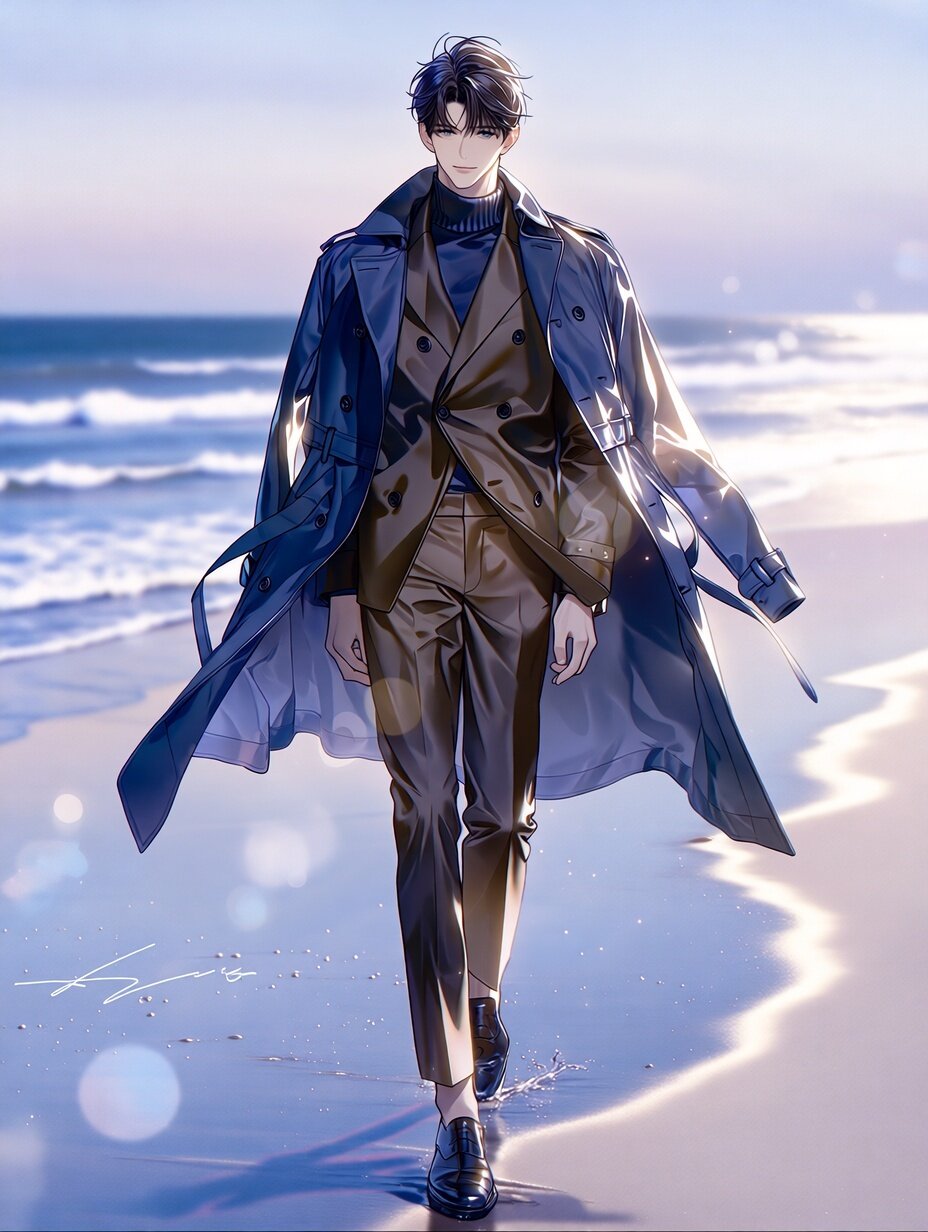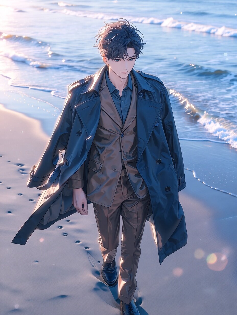 (masterpiece, best quality, highres, 8k wallpaper:1.2), extremely detailed, insanely detailed, (ultra-detailed eyes, sparkling eyes:1.1), (soft lustrous skin), beautiful young man, bishounen, calm and introspective presence, quiet elegance, short black hair, neatly styled with a natural texture, gently moved by the sea breeze, long eyelashes subtly emphasized, clear eyes filled with thoughtfulness, smooth pale skin, refined facial features, elegant jawline, perfectly balanced proportions, wearing a navy trench coat draped lightly over the shoulders, flowing naturally with movement, underneath a brown jacket, tasteful and warm-toned, paired with brown trousers, slim and refined silhouette, black leather shoes, polished yet practical, leaving faint footprints in the sand, (cinematic lighting), (soft focus), dawn light softly illuminating the scene, cool blue and pale pink hues of early morning sky reflecting on his face and clothing, gentle diffused glow flattering the skin, tyndall effect, subtle bloom, refined rim lighting outlining his silhouette against the sea, (glowing light:0.8), natural walking pose, hands relaxed, coat swaying slightly, depth of field, rule of thirds, looking ahead or slightly downward with a calm, reflective expression, background: early-morning ocean, quiet waves rolling in, vast horizon, soft mist above the water, pastel sky transitioning from night to morning, empty sandy beach stretching into the distance, smooth wet sand reflecting the sky, softly blurred background with delicate bokeh highlights from reflected light, transparent and serene atmosphere, modern anime-style digital illustration, cinematic seaside mood, solitude and renewal theme, emotionally restrained yet poetic, elegant travel-like composition, refined and atmospheric character portrait evoking calm, transition, and quiet determination