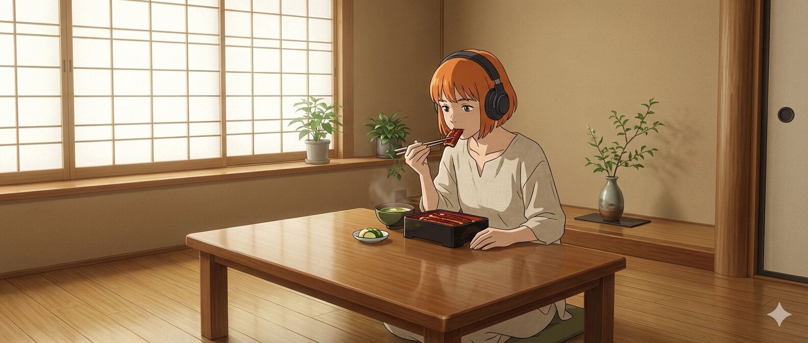 Wide composition, cinematic, ultra-detailed, serene Japanese modern interior. A calm, refined Japanese modern living space on Doyō no Ushi no Hi. The room features clean wooden flooring, soft neutral walls, and minimal furniture arranged with precise balance, expressing discipline, order, and seasonal awareness. Soft summer daylight filters gently through a window, slightly warm and subdued, suggesting heat outside and cool calm inside. At the center, Zena appears small within the wide composition, seated upright at a low table. She has orange bob hair and wears her signature headphones. Her outfit is simple, bright, and clean — light, breathable indoor wear suitable for midsummer, modest yet refined, emphasizing composure. On the table rests a traditional unajū (eel rice box), depicted with high culinary realism: glossy grilled eel layered neatly over white rice, the surface lacquered with rich, dark tare sauce, fine grill marks visible, a subtle sheen reflecting the light, paired with a small dish of pickles and a lacquered soup bowl. Zena holds chopsticks with steady hands. Her posture is straight and dignified, spine aligned, shoulders relaxed, movements calm and deliberate. As she takes a bite, her expression remains composed, yet a quiet satisfaction softens her gaze — not indulgence, but appreciation. The warm brown tones of the eel contrast gently with the cool neutrals of the room, creating a balanced, appetizing composition. No exaggeration, no fantasy effects — only respect for season, food, and body. Ultra-detailed textures, realistic food depiction, subtle natural lighting, Japanese anime cinematic style, soft warm summer color palette, high resolution, peaceful seasonal life scene, themes of nourishment, discipline, and quiet strength.