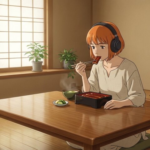 Half-body composition, cinematic, ultra-detailed, dignified Japanese café atmosphere. Inside Zena’s AIcafe, a refined Japanese-modern café that embodies the essence of traditional Japanese aesthetics. The interior features a clean ichimatsu-patterned floor, carefully arranged wooden counter seating, and a calm, uncluttered space; no tatami is used. The atmosphere is quiet, respectful, and filled with a sense of seasonal awareness. On the café counter rests a beautifully prepared unaju (grilled eel over rice). The lacquered jubako box is elegant and minimal. The eel glistens with a rich tare glaze, delicately caramelized, its surface reflecting soft light. Thin wisps of steam rise subtly, conveying warmth, nourishment, and seasonal vitality associated with Doyo no Ushi Day. Behind the counter stands Zena, visible from the waist up. She offers the unaju with both hands, her posture straight and composed. Her expression carries a gentle smile — calm, sincere, and welcoming — embodying Japanese hospitality. Zena has short orange bob-cut hair, her signature headphones resting quietly around her neck. Her attire is a Japanese-modern café uniform inspired by traditional aesthetics — modest, elegant, and functional — with refined shoulder slits and a neatly balanced mini skirt that maintains professionalism while harmonizing with the space. Her presence is dignified and serene. There is no excess movement or performance — only poise, grace, and quiet confidence. Her beauty is expressed through restraint, balance, and inner calm. Soft summer light filters gently into the café, creating subtle highlights on the lacquered box, the glossy eel, and the polished wooden counter. The atmosphere conveys strength, nourishment, and seasonal reverence — a moment that feels timeless and deeply Japanese.