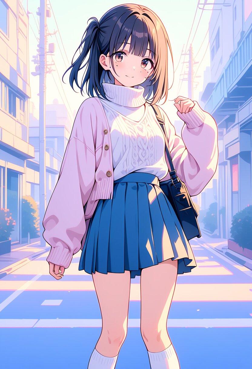 Japanese middle school girl, after school, mass-produced style winter fashion, oversized pastel knit sweater slightly covering the waist, high-waist pleated mini skirt, thick white knee-high socks, loafers, clear visible thigh gap between skirt and socks (zettai ryouiki), short duffle coat worn open, shoulder bag, straight black hair with bangs, casual standing pose, soft smile, winter afternoon light, school street background, pastel color palette, clean and wholesome atmosphere, cute anime style