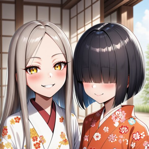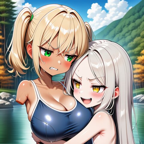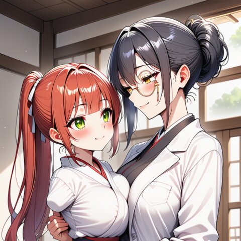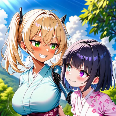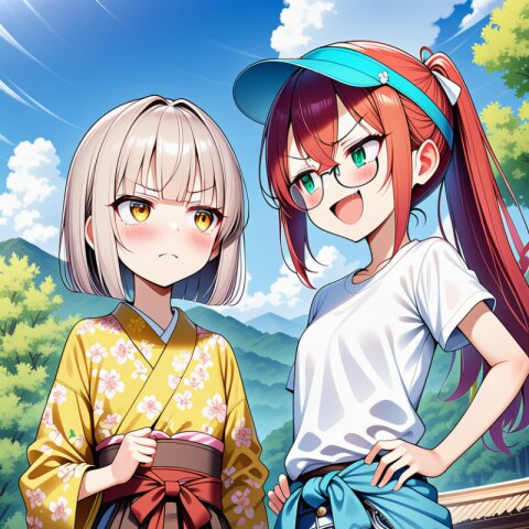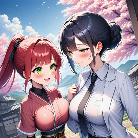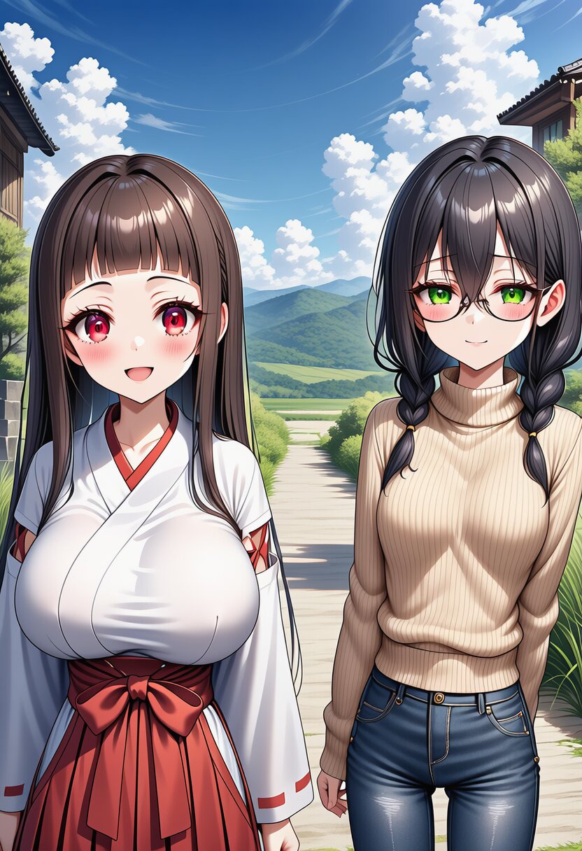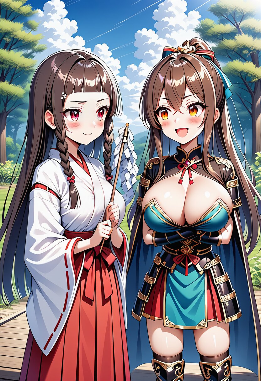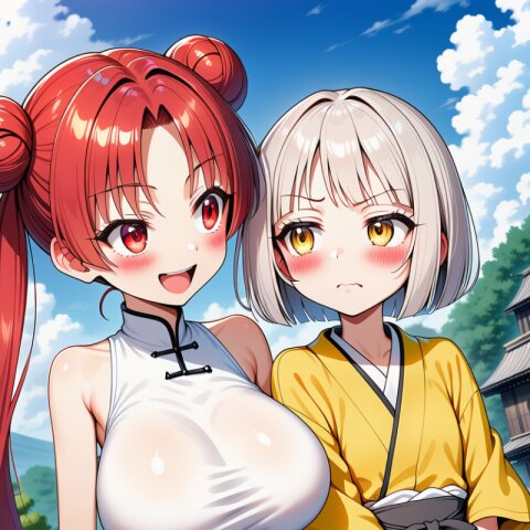 ai-generated, year 2024, anime style, 2girl, side by side, looking at viewer, midday, outdoor, 1.0::in oriental countryside::, from front, masterpiece, best quality, ultra detailed, perfect fingers, high resolution, absurdres, perfect anotomy, detailed background, unity 8k wallpaper, location, -2.5::hugging::, very aesthetic, masterpiece, no text