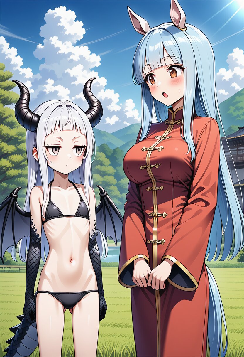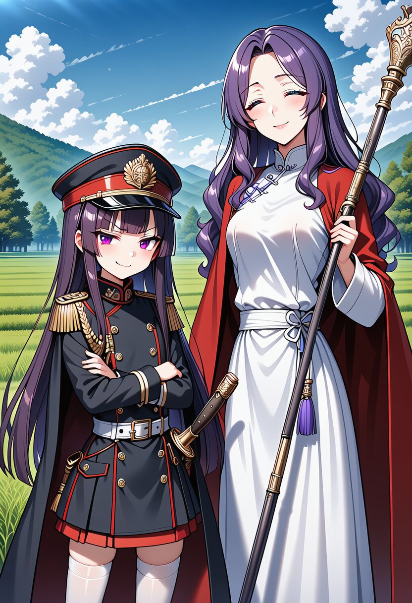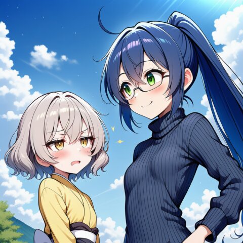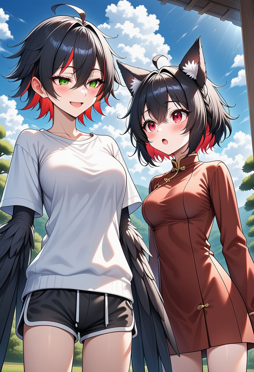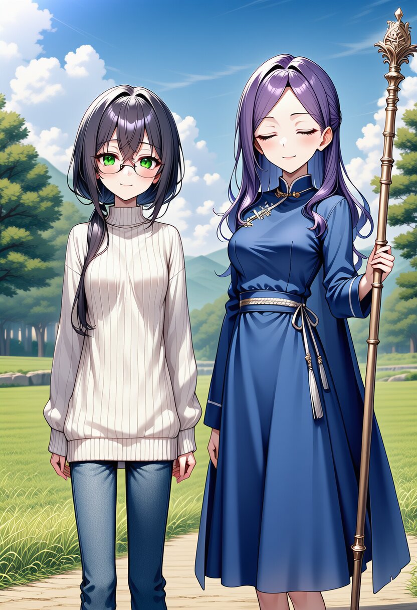 ai-generated, year 2024, anime style, 2girl, side by side, looking at viewer, midday, outdoor, 1.0::in oriental countryside::, from front, masterpiece, best quality, ultra detailed, perfect fingers, high resolution, absurdres, perfect anotomy, detailed background, unity 8k wallpaper, location, -2.5::hugging::, very aesthetic, masterpiece, no text