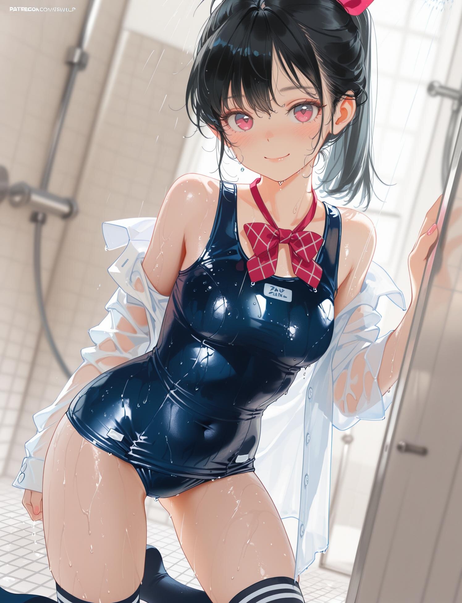 黒髪ポニーテール、中乳、((loli0.7))、zettai_ryouiki、best quality, masterpiece, photorealistic, realistic, ultra high definition, ray tracung、blurry background、cherry pink lip、Old school swimsuit, (perfectly fitted school swimsuit), white blouse with all the buttons open, red checked ribbon around the neck, white over-the-knee socks, ((absolute territory)), (wet clothes), wet skin, shower room, kneeling, strong depth of field, blurred background,smile,light_blush,looking_at_viewer,Chest_focus,