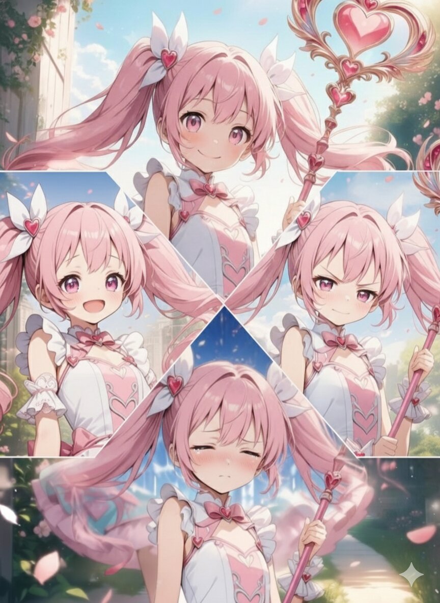 score_9, score_8_up, score_7_up, (multiple views:1.2), chart, character sheet, 1girl, solo, pink hair, long hair, twin tails, pink eyes, magical girl, frilled outfit, heart hair ornament, holding staff, (expression sheet:1.1), (smiling, laughing, angry, crying:1.1), looking at viewer, upper body, masterpiece, ultra-detailed, highres, cinematic lighting