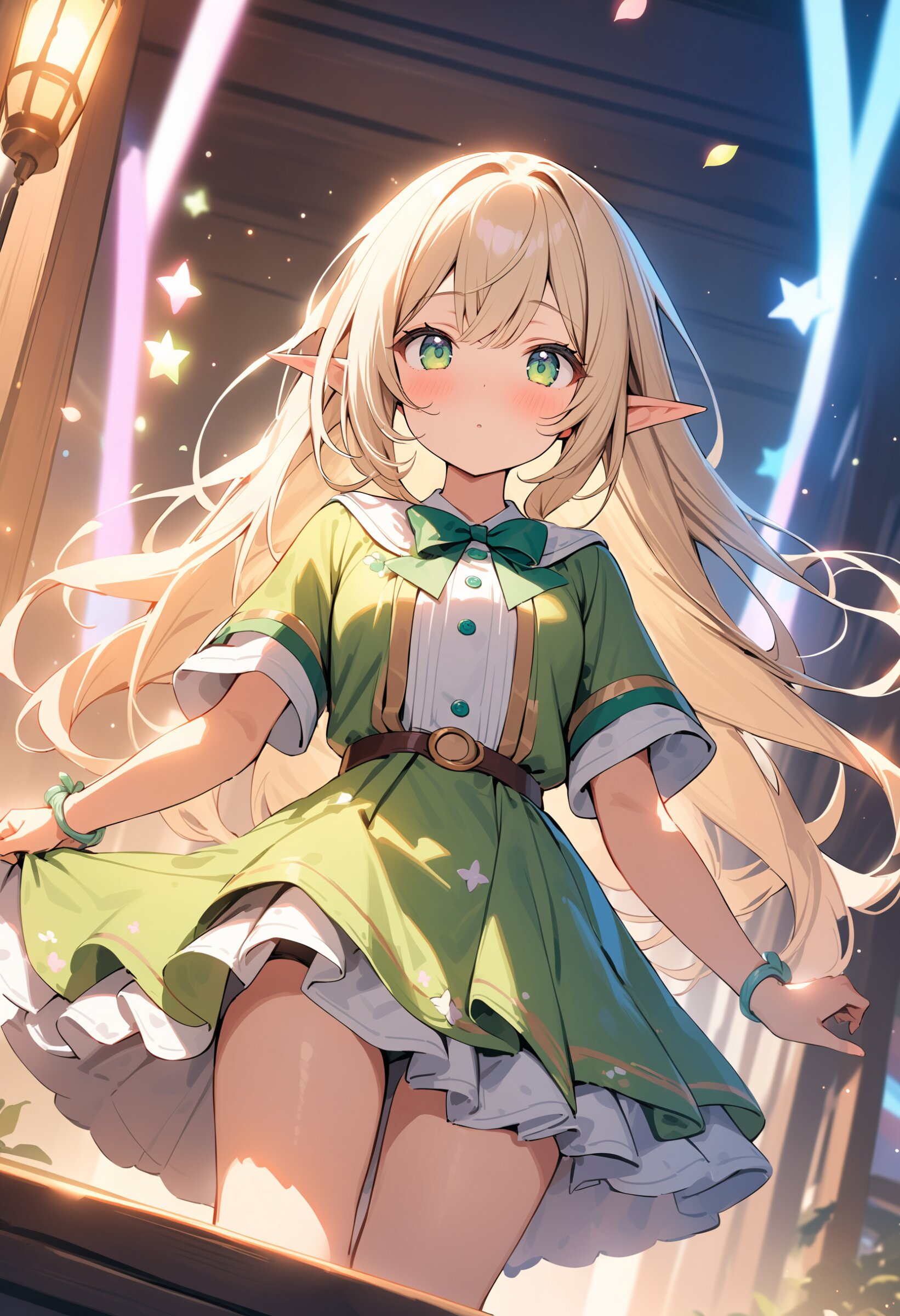 ((masterpiece)), ((best quality)), ((kawaii)), cute, (lovely), ((extremely detailed)), (beautiful), dynamic angle, a cute girl, 1girl, solo, ((elf)),beautiful blond hair, beautiful green eyes, ((beautiful eyes)), long hair, fantasy clothes,