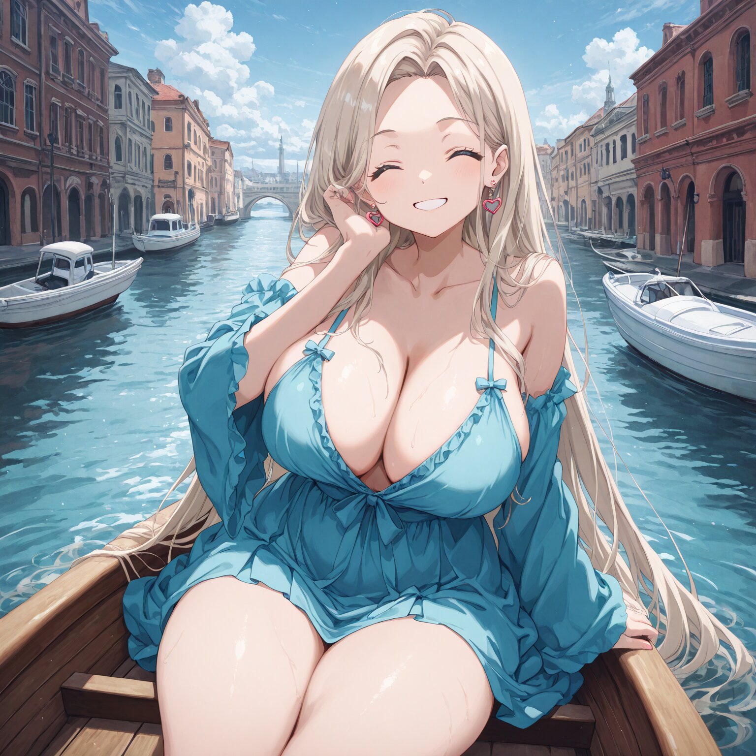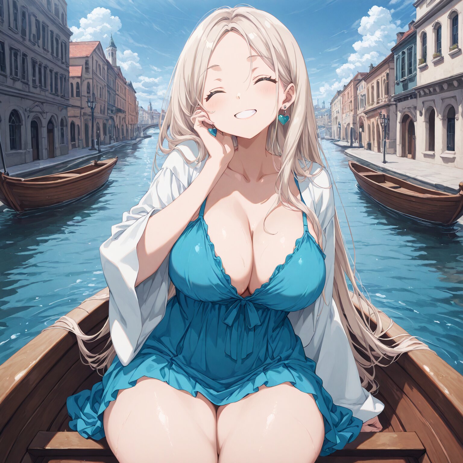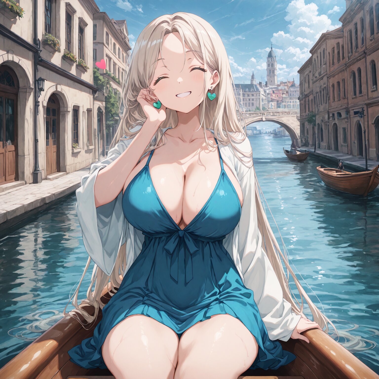 1girl, parted bangs, forehead, (center-parted bangs:1.2) Platinum blonde hair, beautiful hair, beautiful eyes, green eyes, very long hair, abnormally long hair, straight hair, (Adults, voluptuous bodies, very large breasts, heavy breasts, long breasts, round breasts:1,2), fat, loose stomachs, thick thighs,, thick thighs, heart earrings, (((eyes closed))), smiling Blue one-piece dress, wide sleeves Hand on cheek, waving, On a boat Venice, canals, the river flowing through the city BREAK, (newest, anime, animation, anime screen capture, anime style:1.3) BREAK, (masterpiece, , vibrant, very aesthetic, highly detailed, best quality, 16k:1.3)